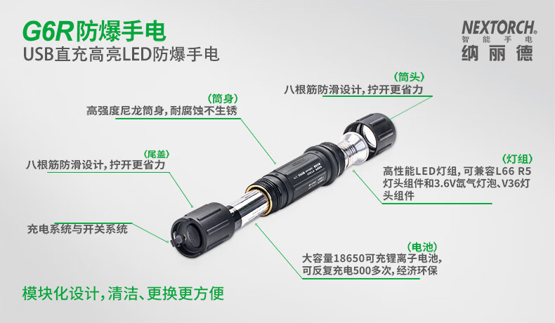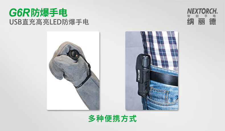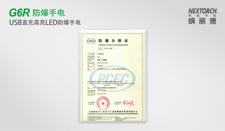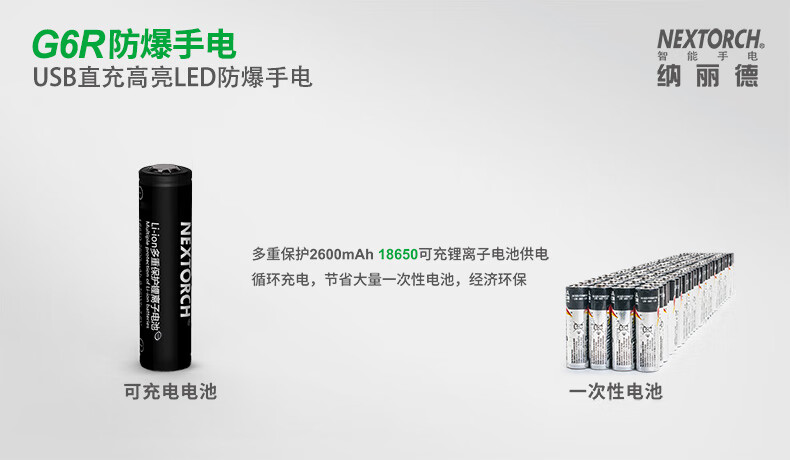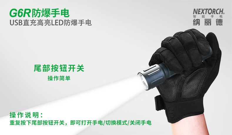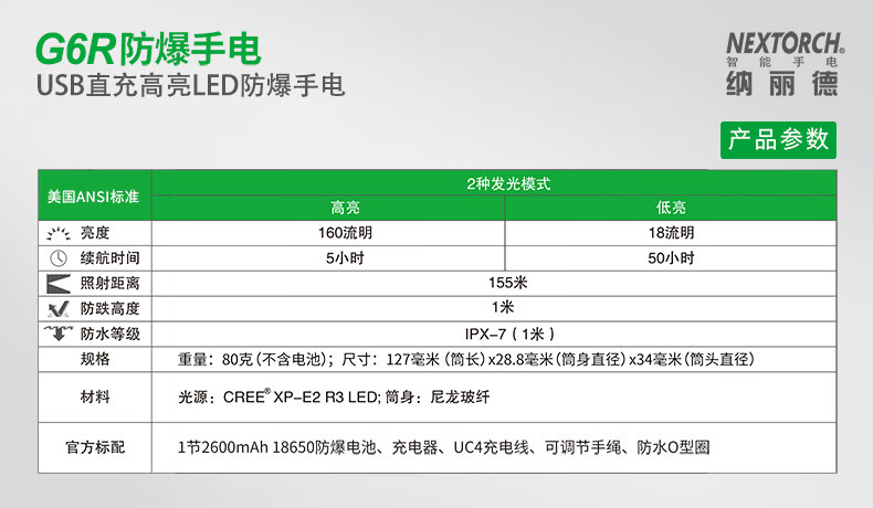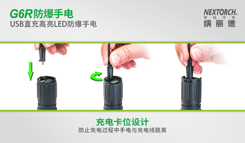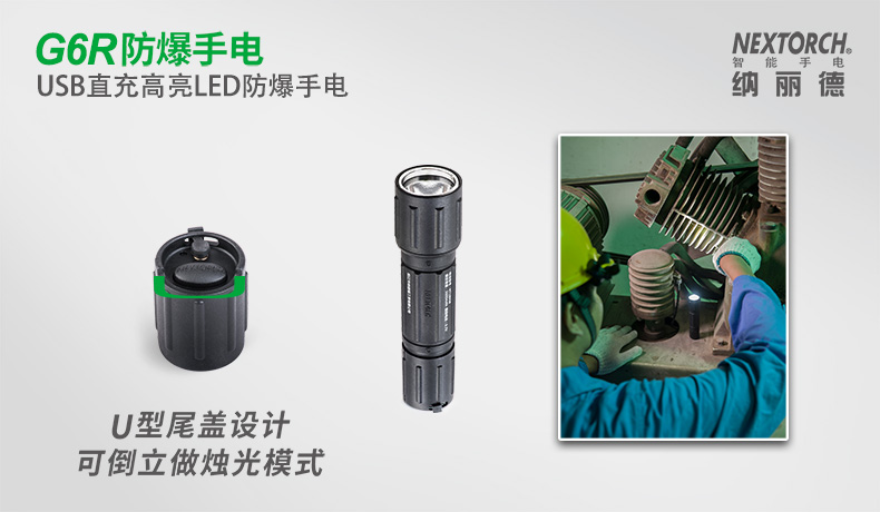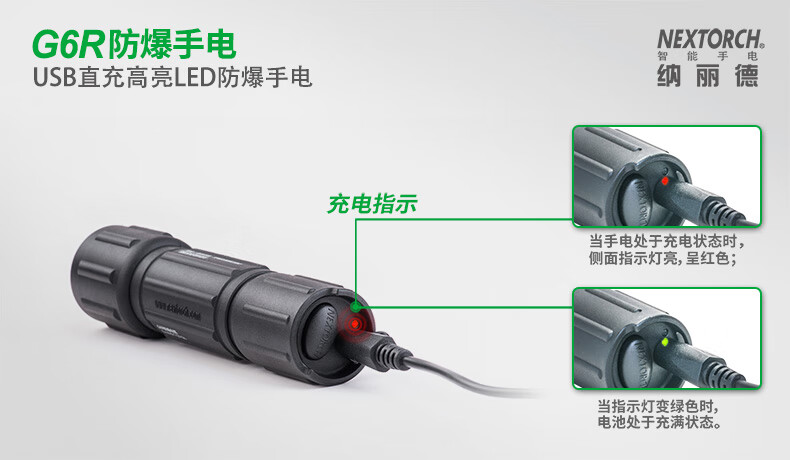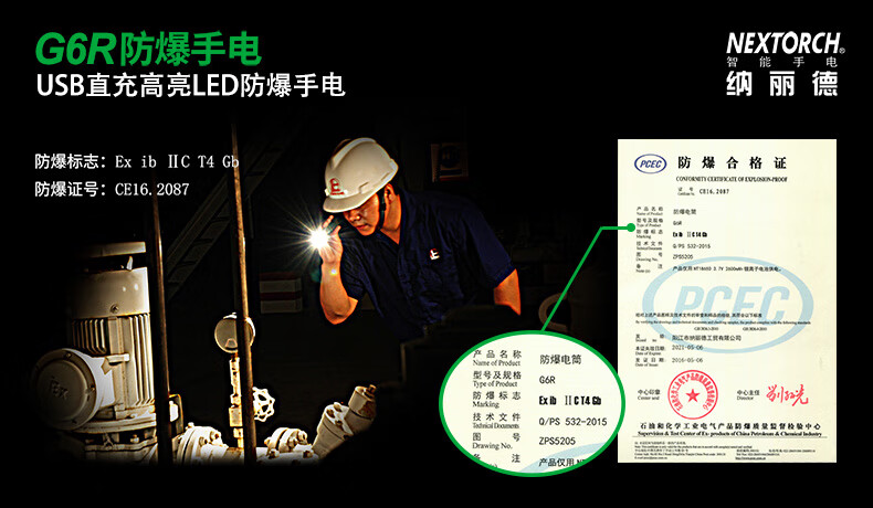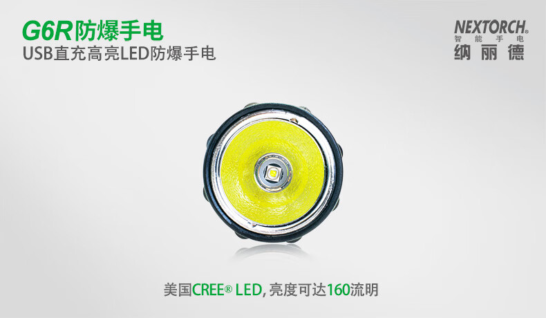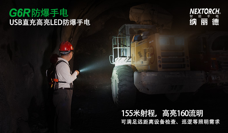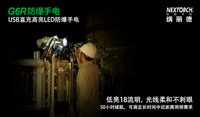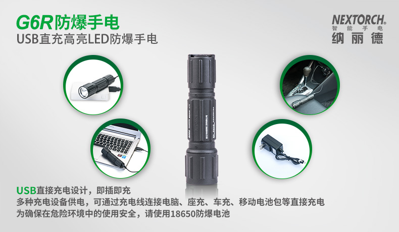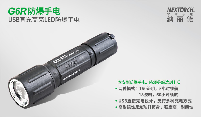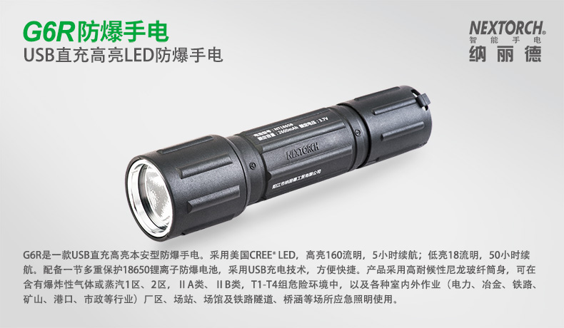G6R是一款USB直充高亮本安型防爆手电。采用美国CREE® LED,高亮160流明,5小时续航;低亮18流明,50小时续航。配备一节多重保护18650锂离子防爆电池,采用USB充电技术,方便快捷。产品采用高耐候性尼龙玻纤筒身,可在含有爆炸性气体或蒸汽1区、2区,ⅡA类、ⅡB类,T1-T4组危险环境中,以及各种室内外作业(电力、冶金、铁路、矿山、港口、市政等行业)厂区、场站、场馆及铁路隧道、桥涵等场所应急照明使用。