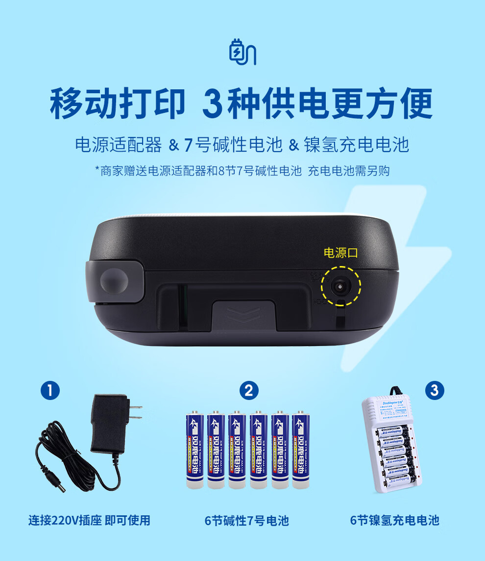 可以充电 也可以用电池 7号电池好像得6节 有点费 送了一套电池 还是插电用好点吧 还送了小包 打印纸 很贴心 机子看起来很复古