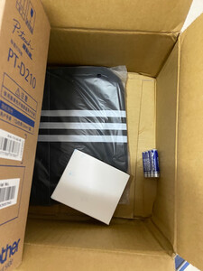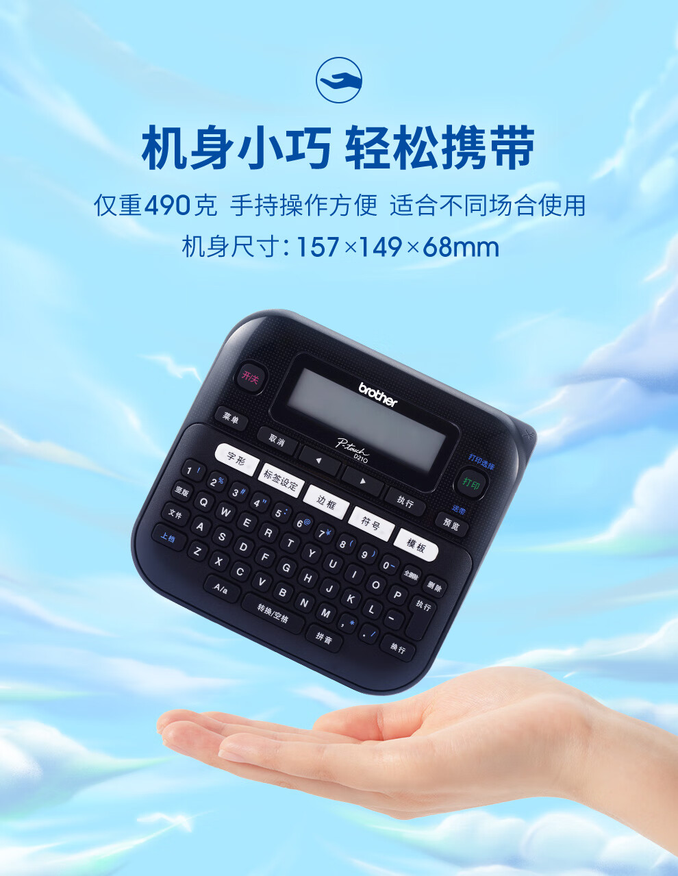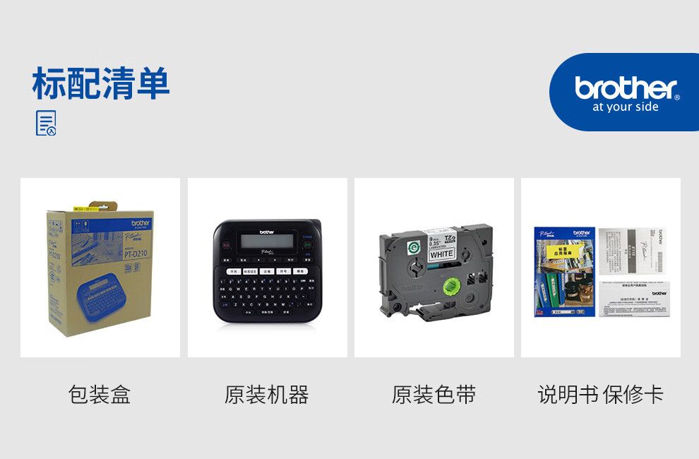 PT-D210单机版标签机、保修卡、说明书、随机赠送1盘标签带,单肩包一个,原装电源一个,6节7号干电池