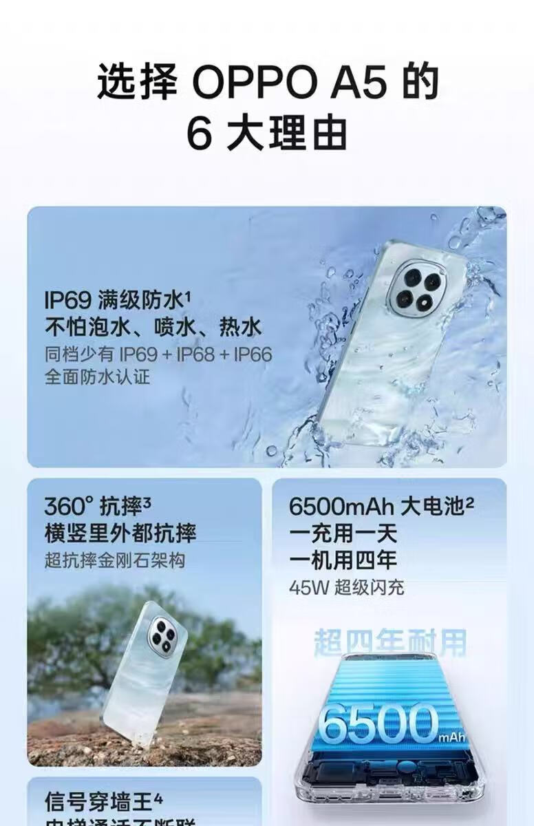 OPPO A5 【分期免息白条可选】IP69满级防水 360°抗摔 6500mAh超四年耐用大电池 5G 智能手机 云母蓝 8GB+128GB 官方标配