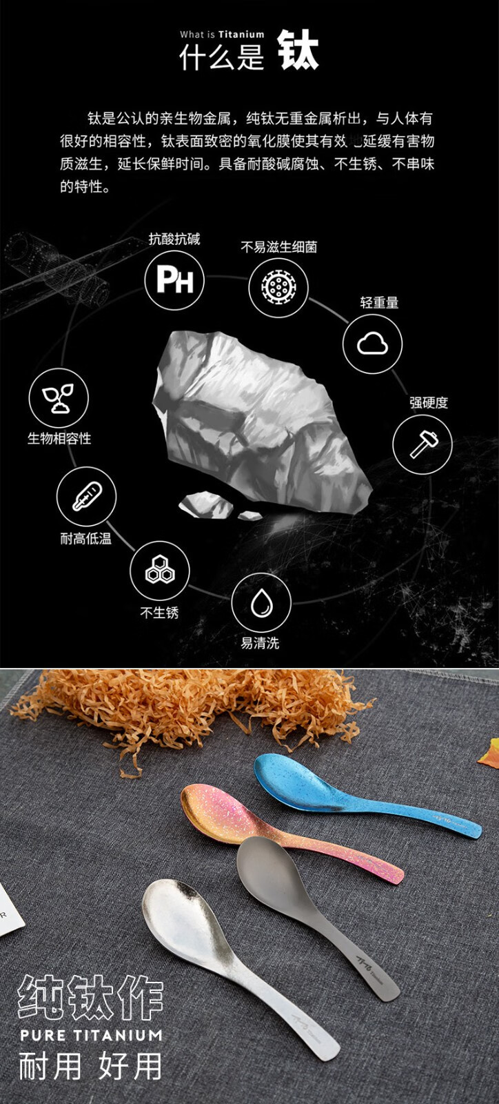 ⭐⭐⭐⭐⭐ **“纯钛真香警告!外卖木勺直接扔!”** 🚀 钛途这波属实降维打击——花几十块买把**航天级纯钛勺**,用出千元级体验! **轻到反科学⚖️**: ☁️ **≈3g超羽量**!比不锈钢轻60%,塞钱包里无存在感,露营登山包里塞10把都不累赘! 🧪 **钛合金Buff叠满**:泡酸辣粉不留味✔️ 磕陶瓷碗不缺口✔️ 婴儿啃咬0金属味✔️(宝妈狂喜!) **冷门神操作💥**: 🔥 **烧不弯的硬核体质**:实测明火烤10秒秒变“汤勺”,野炊直接当料理勺用! 🧊 勺柄导热巨慢,热粥入口不烫手! **颜值报表🎆** 七彩锤纹工业风!做工精致颜值报表! **性价比暴击**: 💰 **一杯奶茶=传家宝**!医疗级钛材抗腐蚀能力拉满,用十年依旧闪亮如新✨ 钛途你是懂极简生活的!外卖党终极兵器!宝妈辅食神器!一勺传三代!