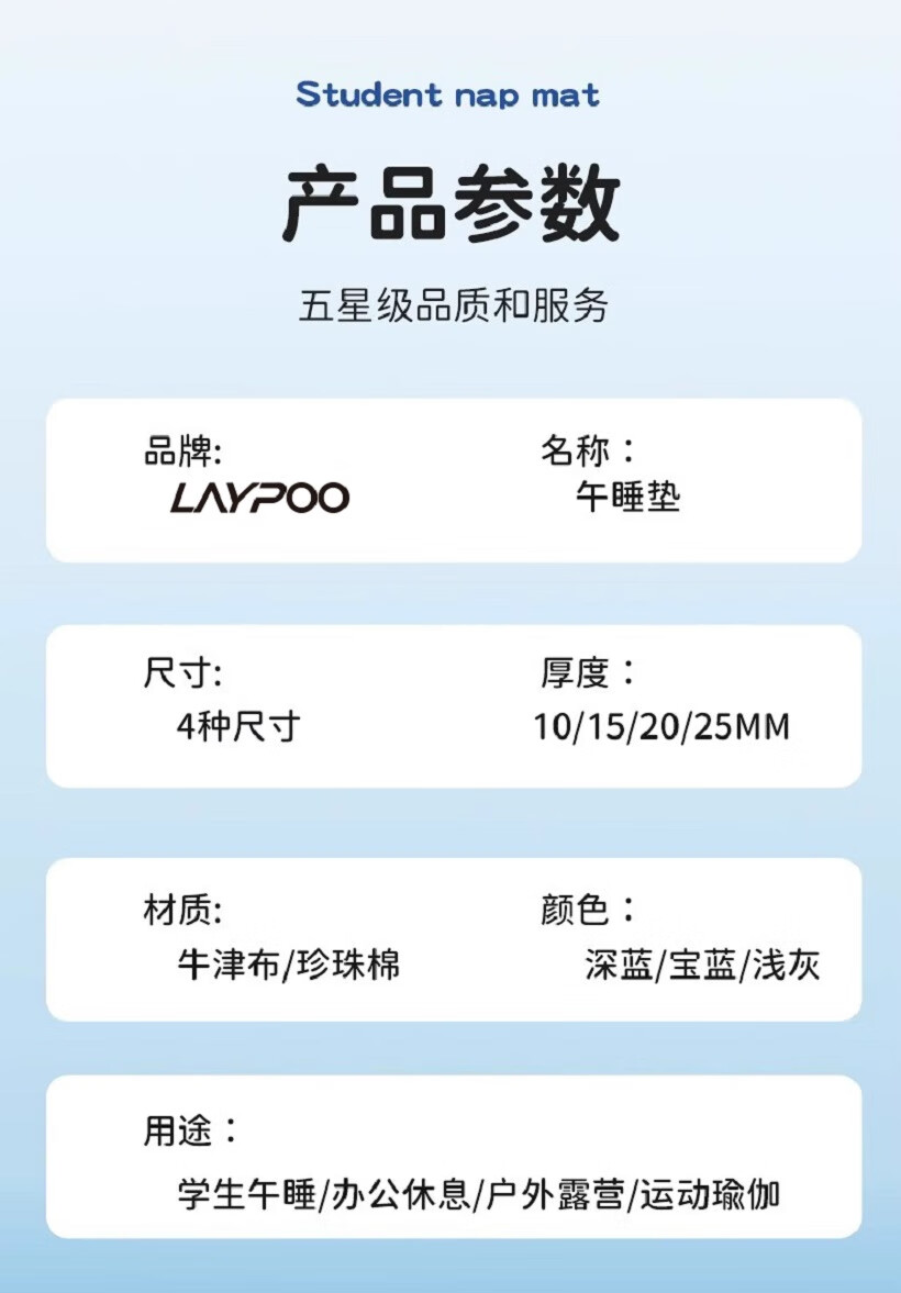 午睡垫收到很惊喜,客服主动确认使用环境给了建议,配送准时,三天内送达,做工精细,走线工整没有线头,厚度适中,午休时不会觉得地板太硬,从咨询到使用都很愉快~