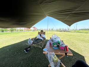 我已经拆开做过了,然后味道比较大,我又把它装起来放到阳台晾一下,我阳台上这个桌子是1米2的,所以这个折叠起来的尺寸大概是1米1多还是比较大的,不是很容易携带需要。那个用车拉到露营的地方。