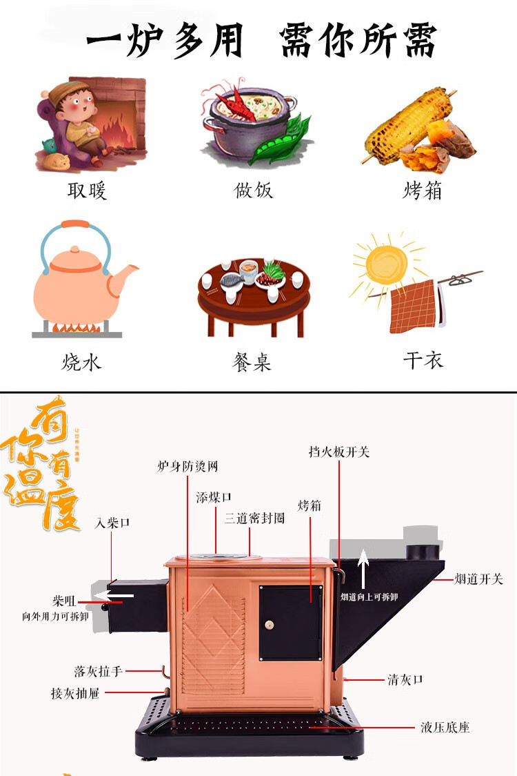 满钵取暖炉柴火灶烤火炉柴煤两用多功能回风炉室内无烟农村家用 0.8米 不锈钢单桌面 煤炉