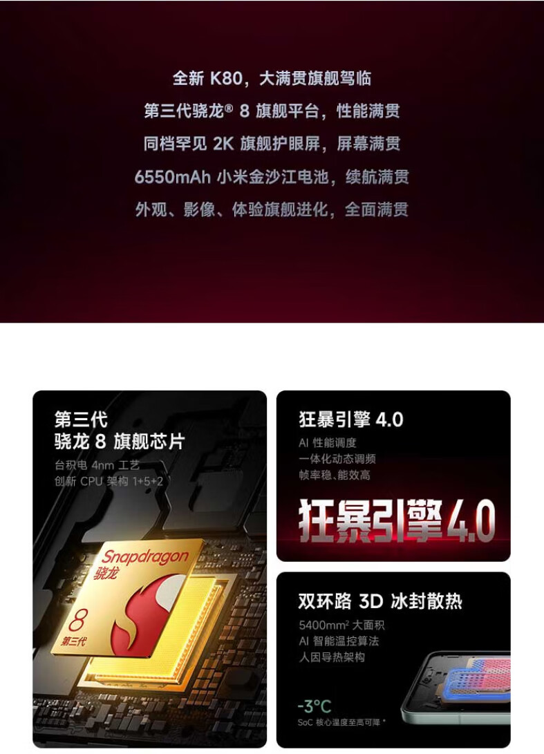 小米REDMI 红米k80 新品5G小米红米手机 第三代骁龙 8 6550mAh大电池 玄夜黑12GB+256GB 官方标配