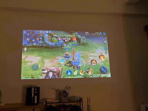 投影仪收到立刻试用了一下,清晰度比我之前买的那款好很多,拍了一下白天拉上窗帘后的效果,不用幕布打在白墙上也是挺清晰的,颜色很鲜艳。投影仪本体比我想象中的轻巧很多,床头柜可以放下。操作很方便,侧投也很好调节。
