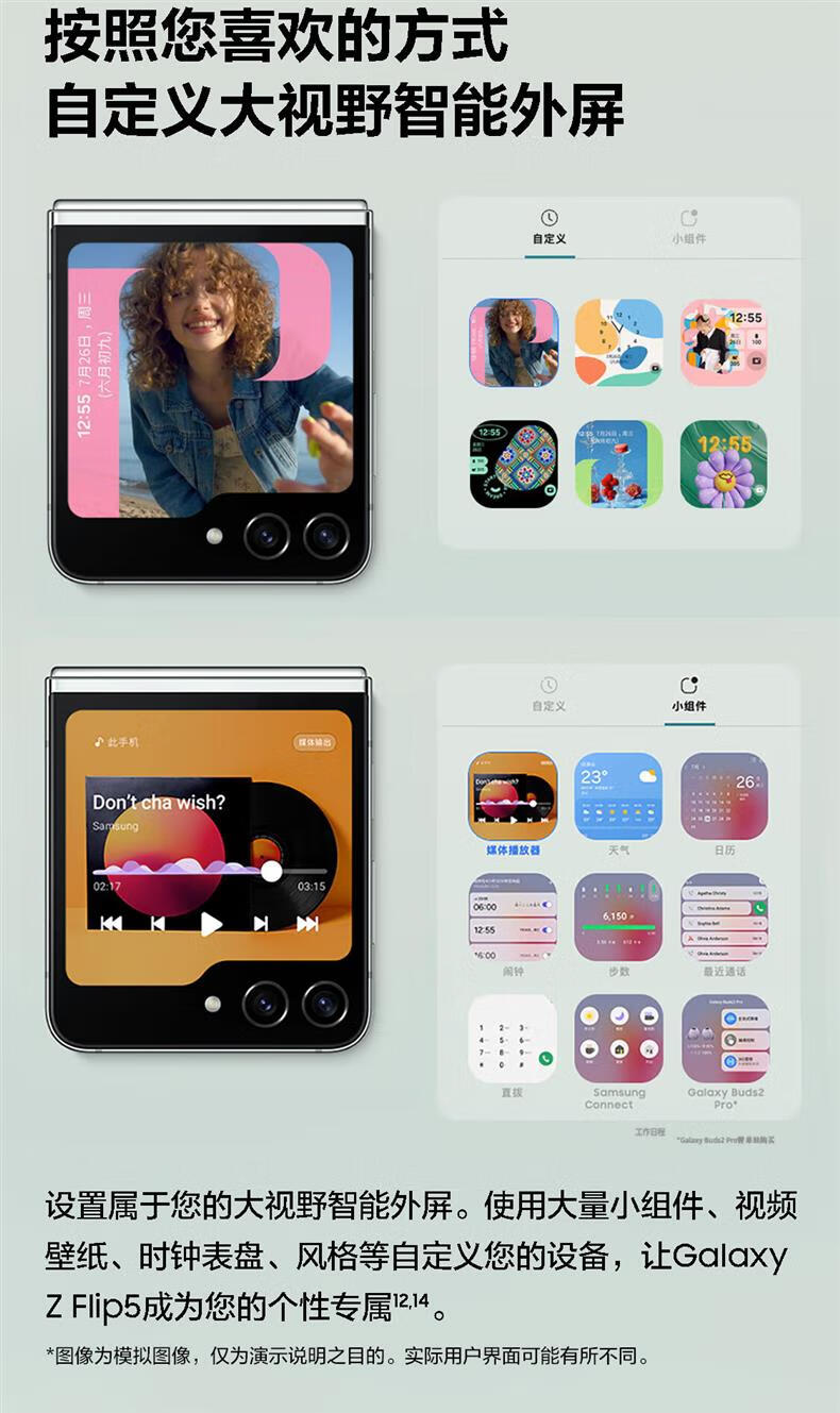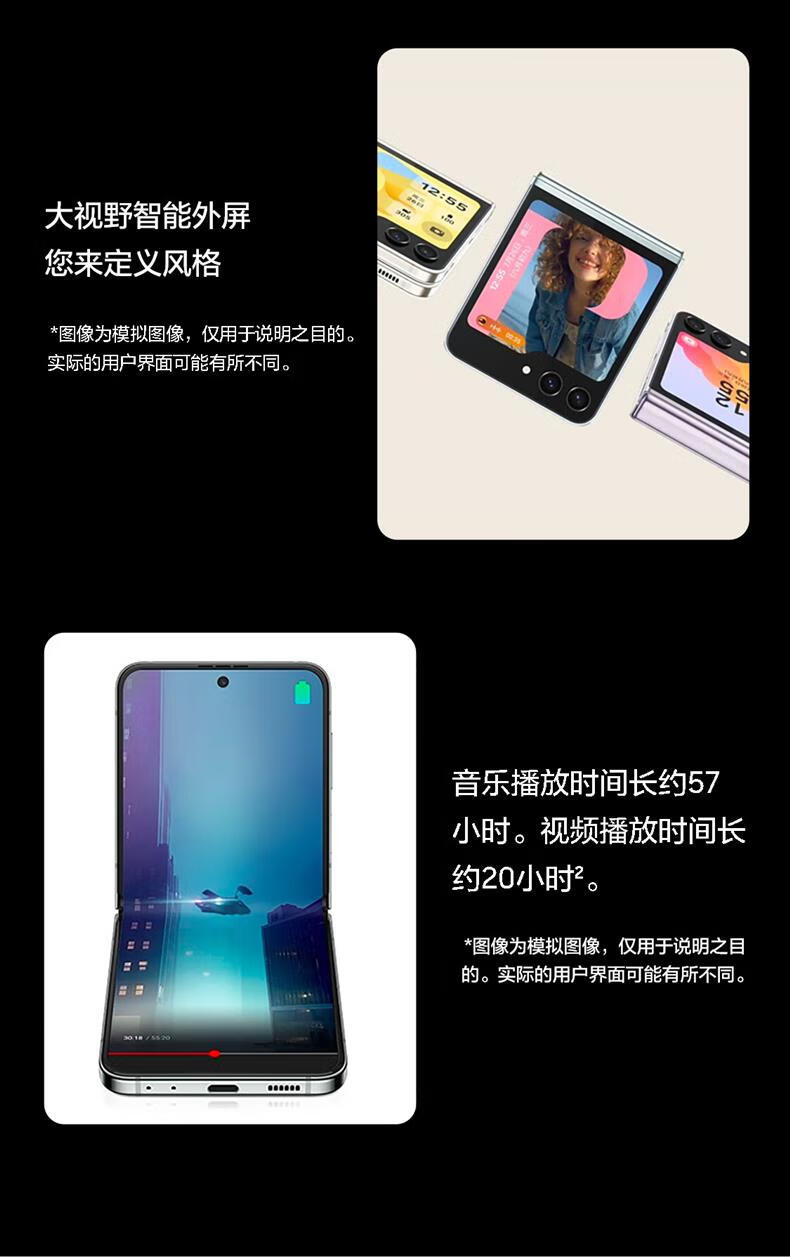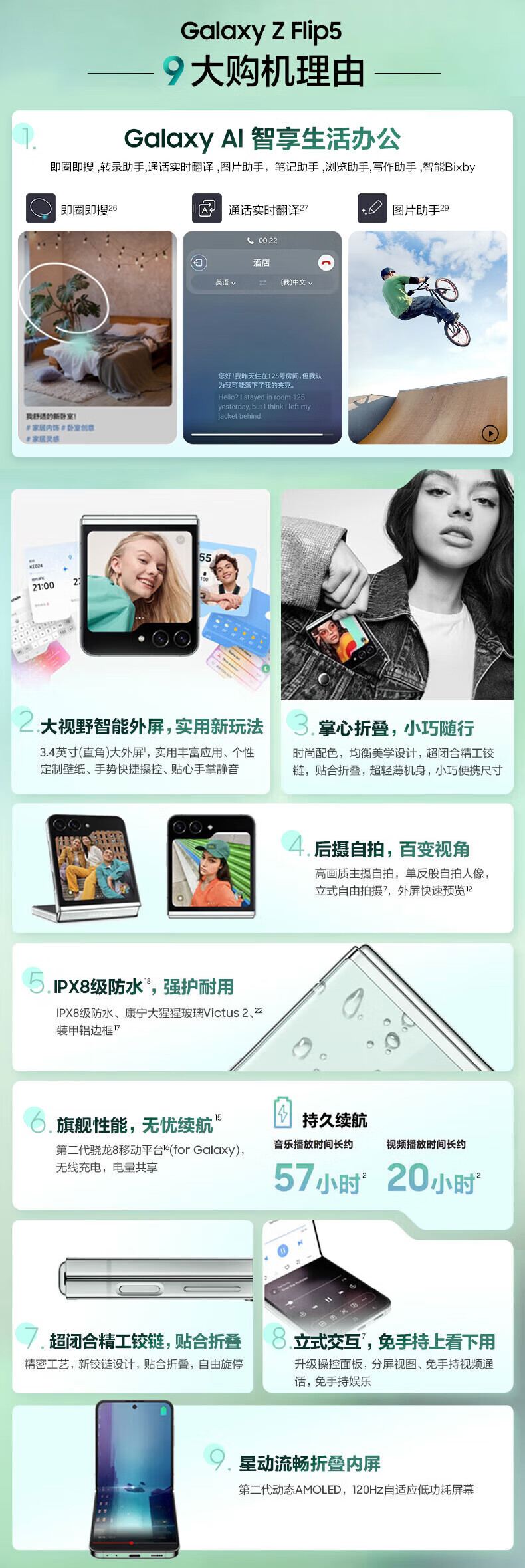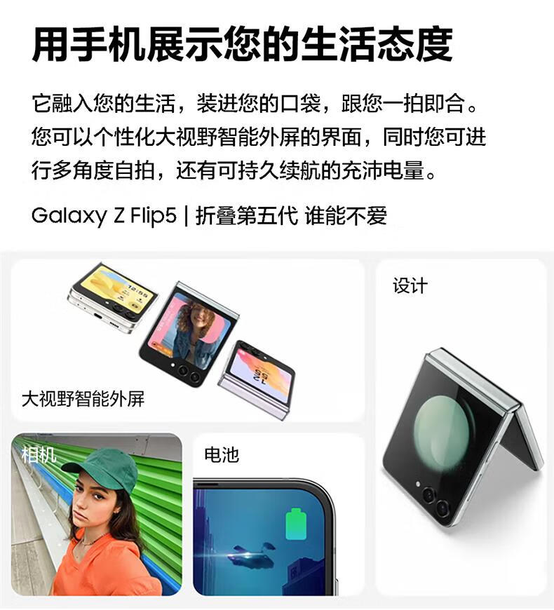 三星Galaxy Z Flip5分期免息白条可选 AI 智能外屏 掌心折叠 同声翻译 智能修图摄像 折叠屏手机 冰薄荷 8GB+512GB