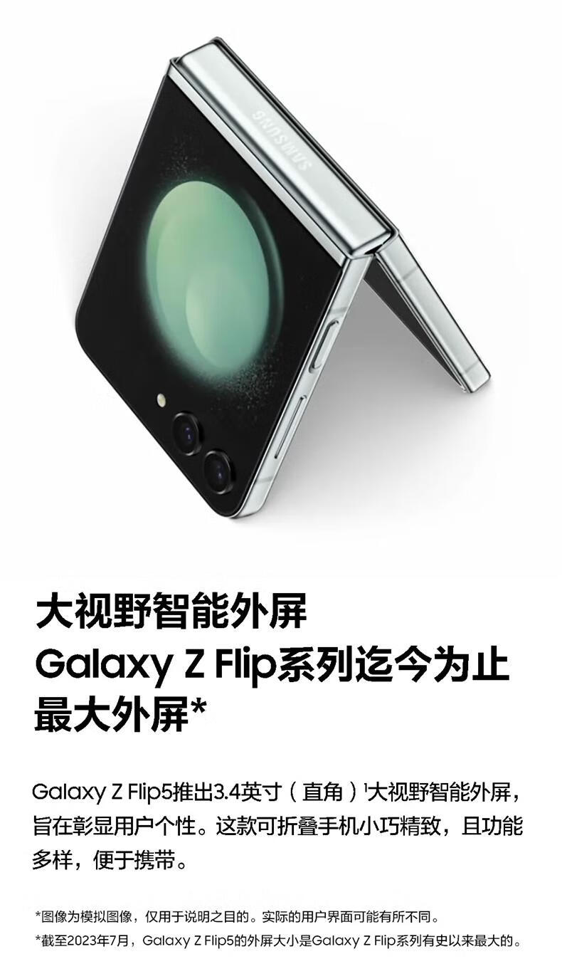 三星(SAMSUNG)Galaxy Z Flip5 AI 分期免息白条可选 掌心折叠 同声翻译 智能修图摄像 折叠屏手机 冰薄荷 8GB+512GB