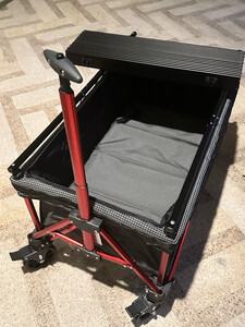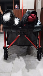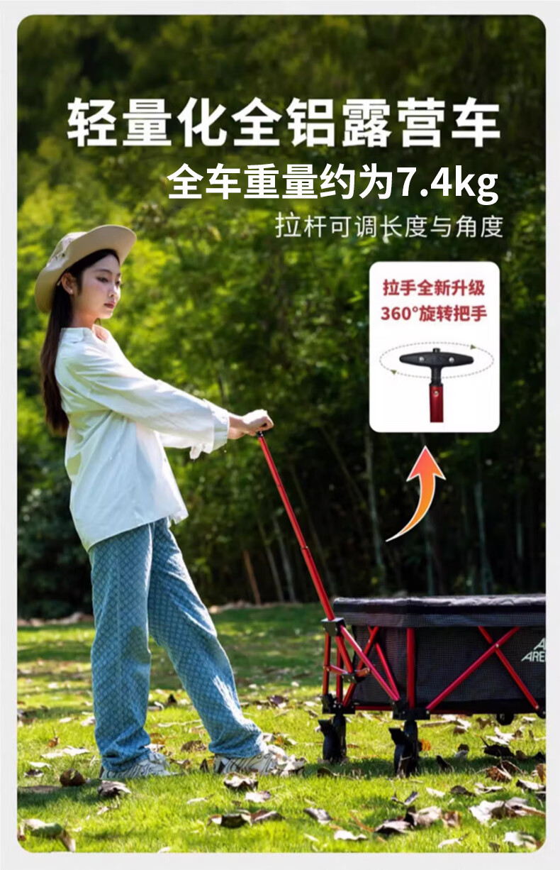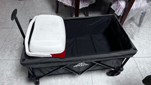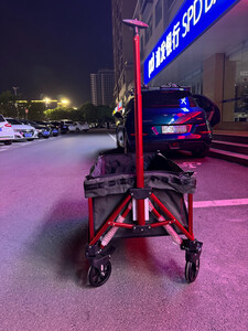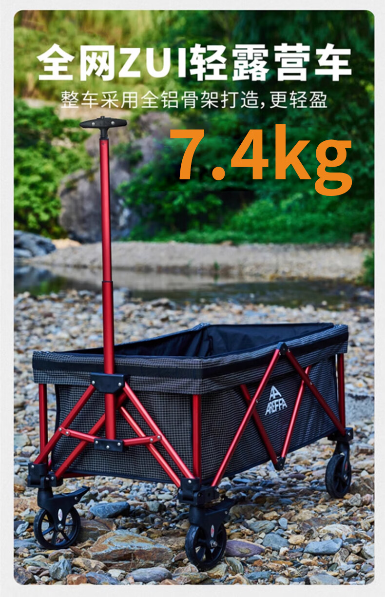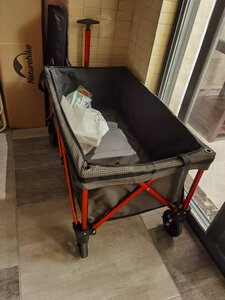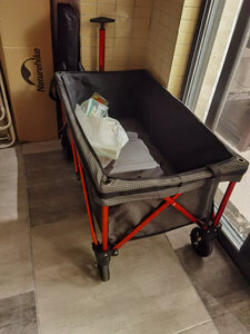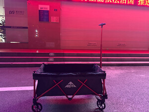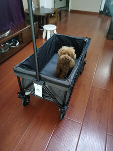 网上选了很多款,做了一定的功课比较,收纳起来很小巧,不占地方,推拉也很轻松。 车子的自身七公斤多,还好拎得动,想想如果买了其他款的,动辄是20斤就会显笨重了,下次露营可以带上推车,带上心爱的小宠物出去浪了。
