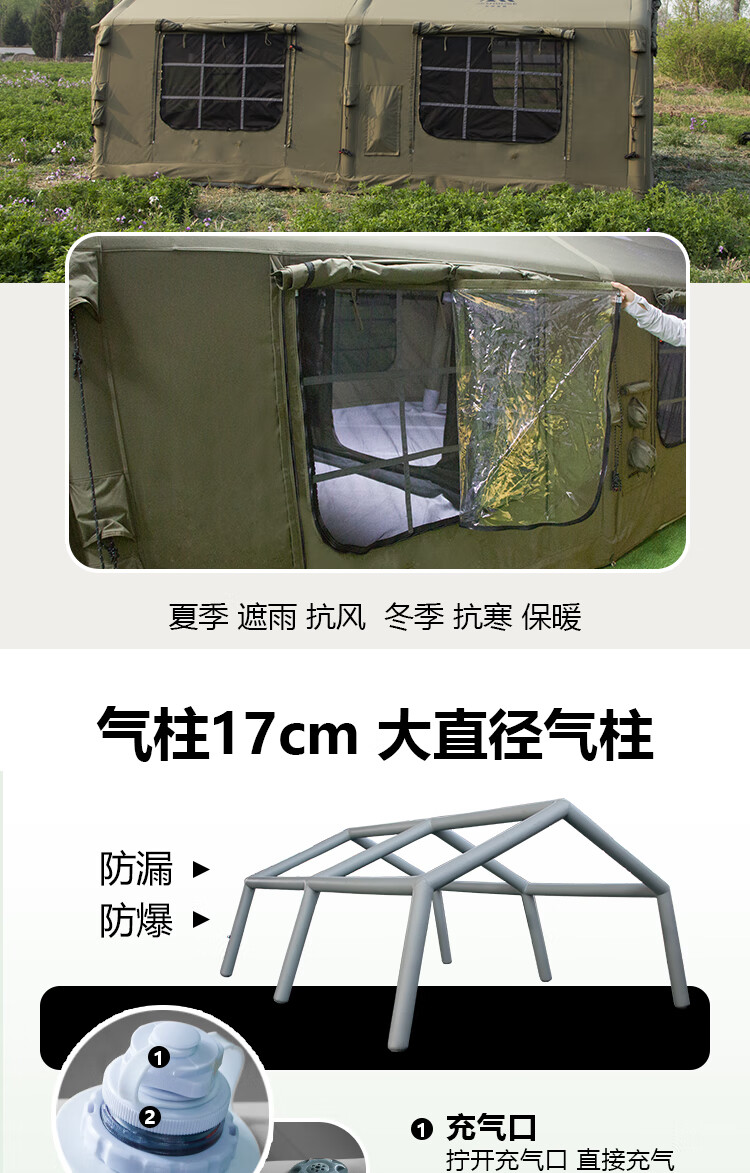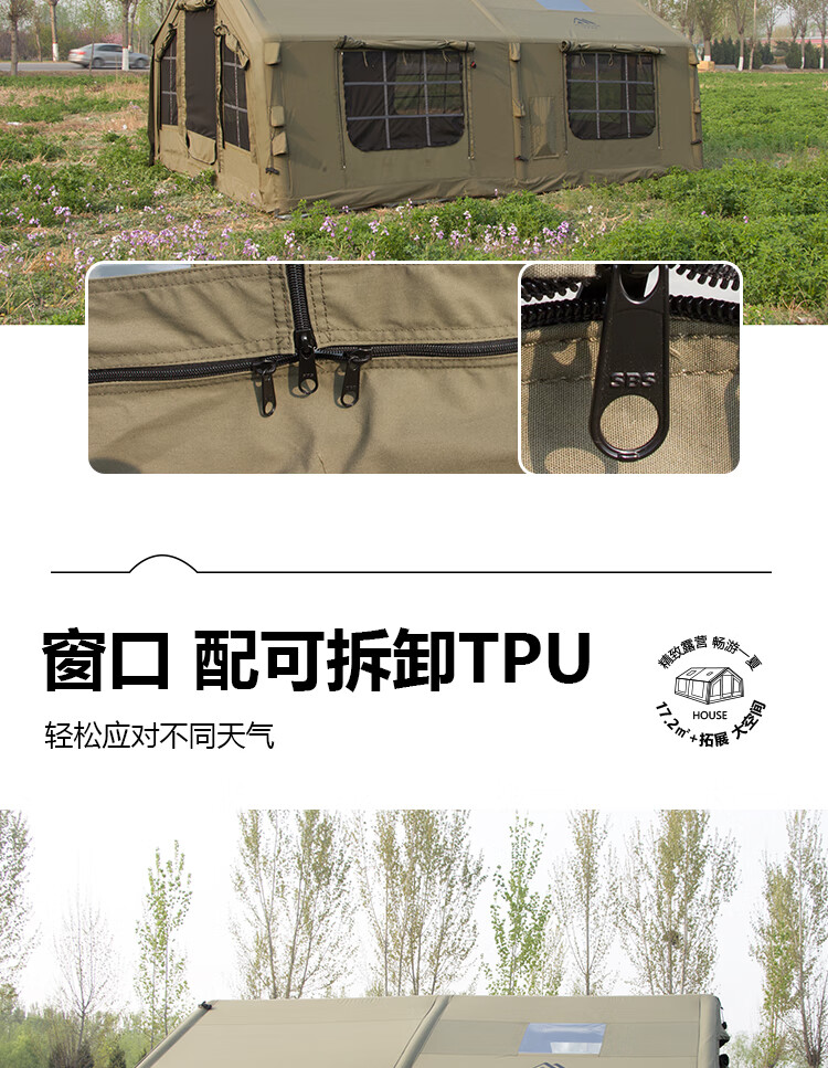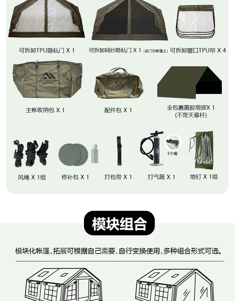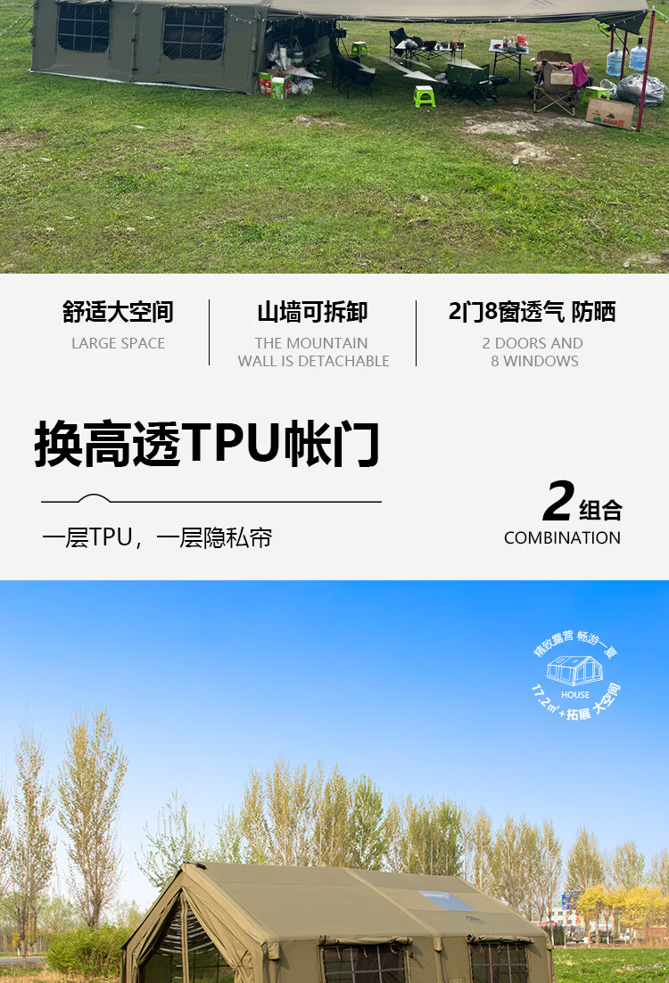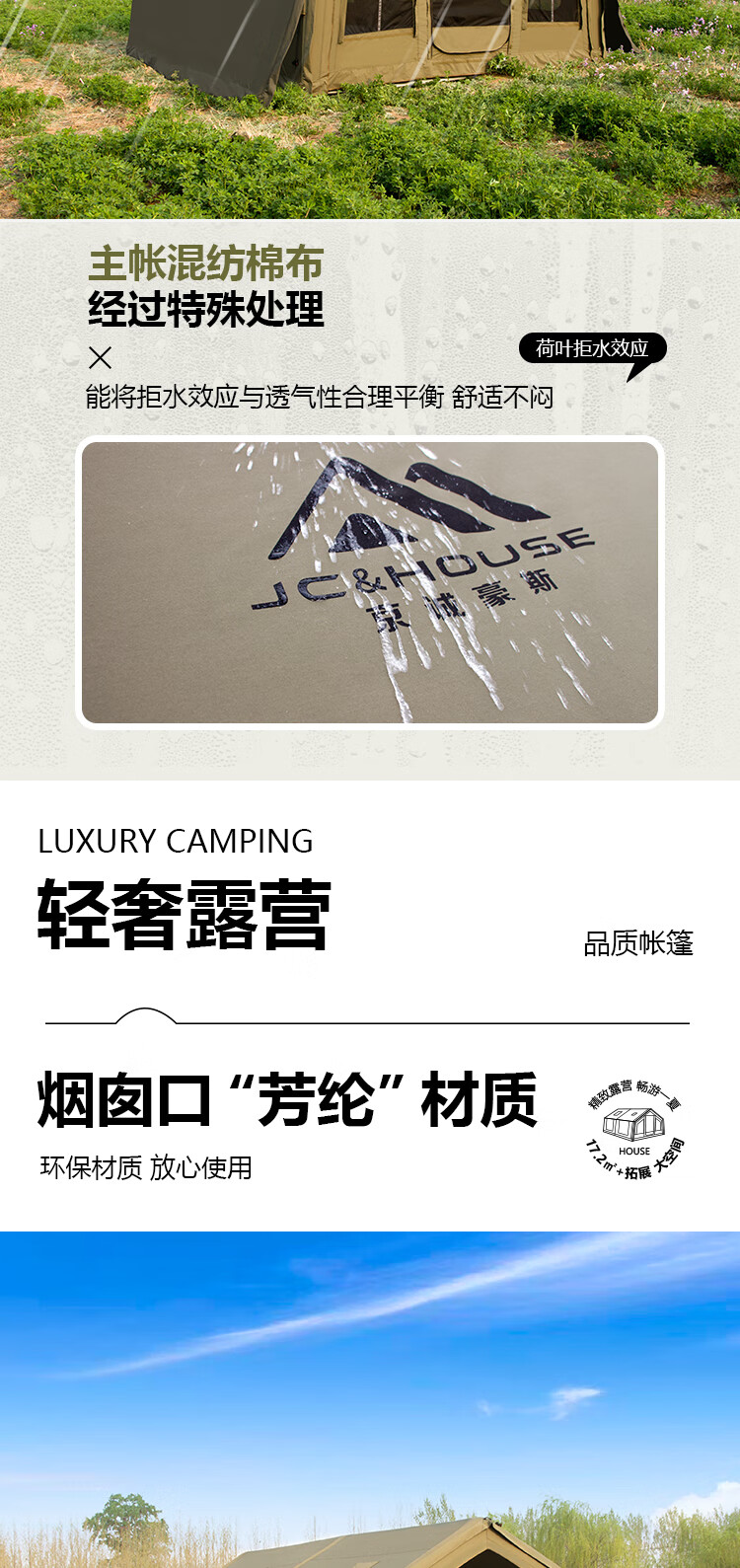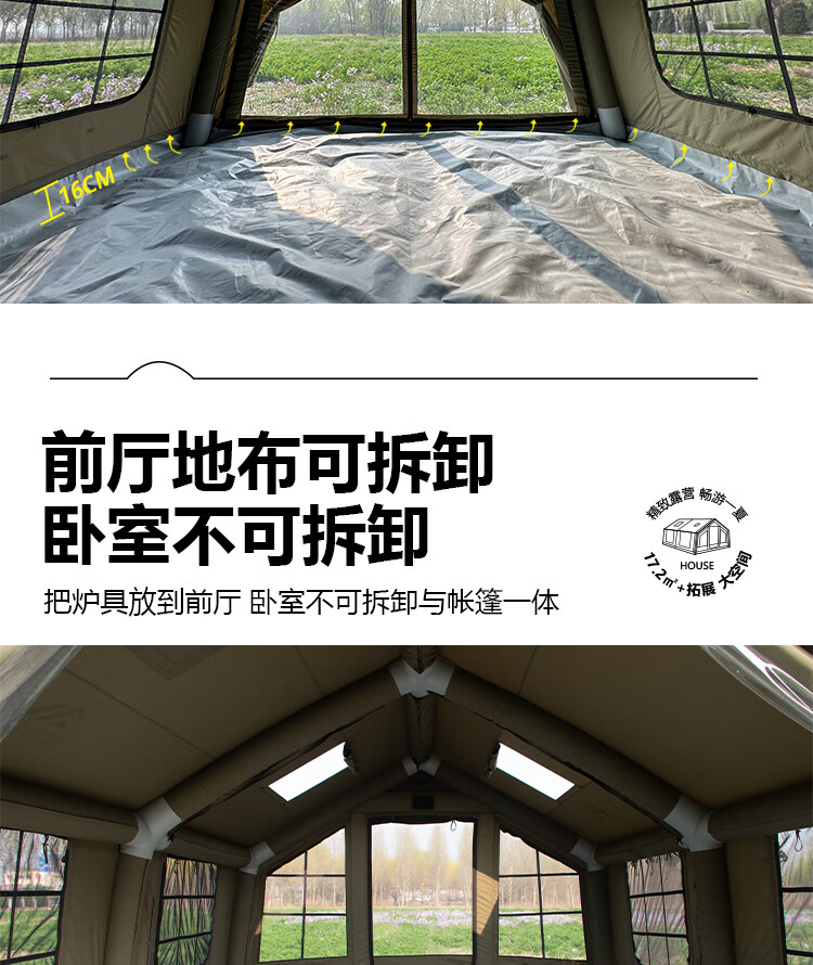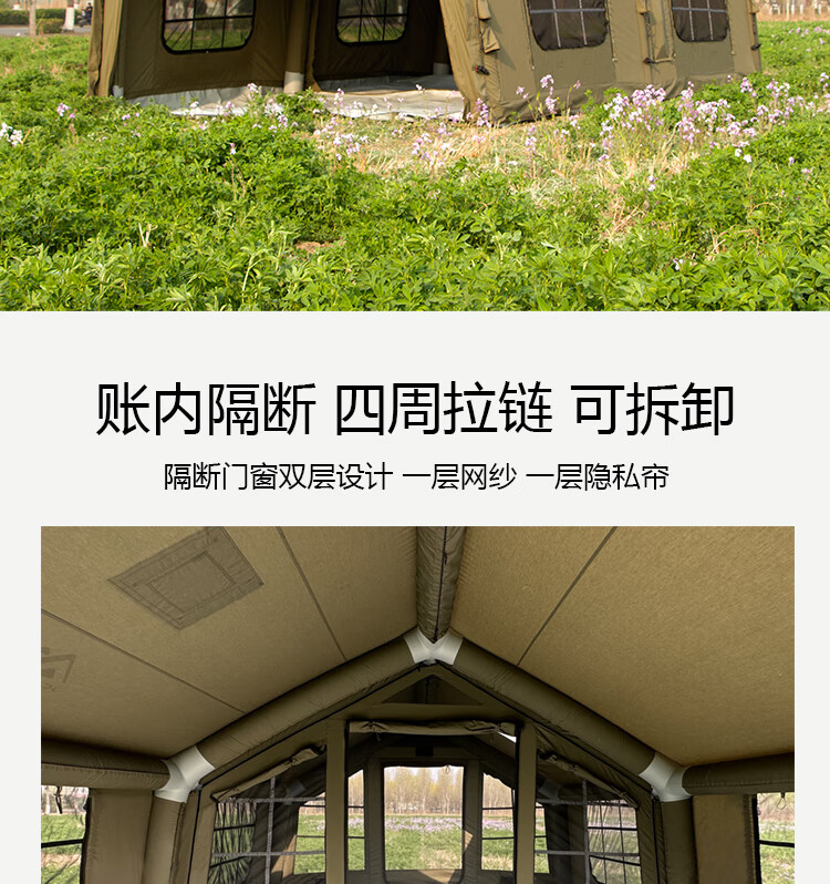京诚豪斯JcHouse新款17.2㎡棉布充气帐篷17.2平户外露营长搭过夜屋脊 豪斯17.2平军绿主帐+黑胶天幕