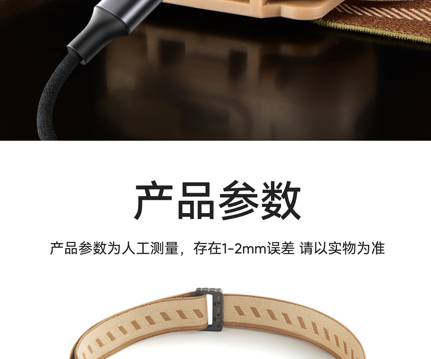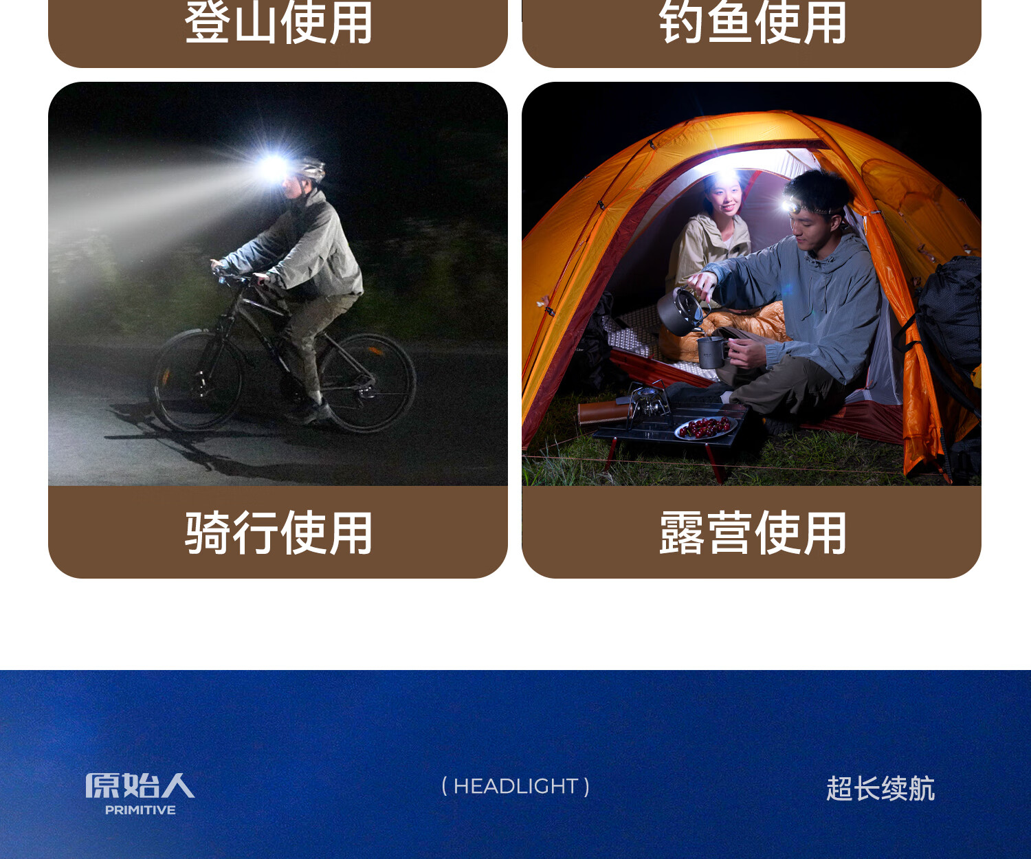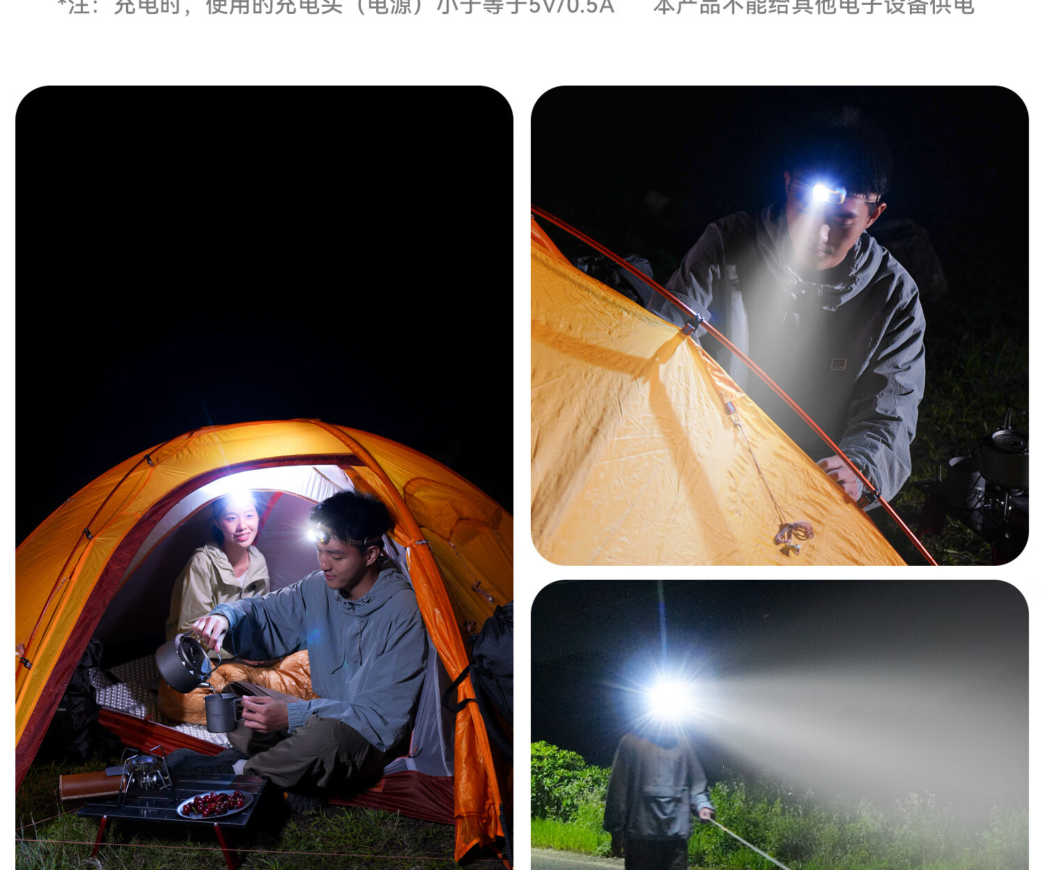 产品材质:塑料材质,很轻便易携。 光照强度:光照挺亮的,近处非常亮。 续航时间:充满电,一档两三个小时,可以用四次左右。 产品重量:很轻便,直接套头上都行。 电源类型:锂电池,电池电量大。
