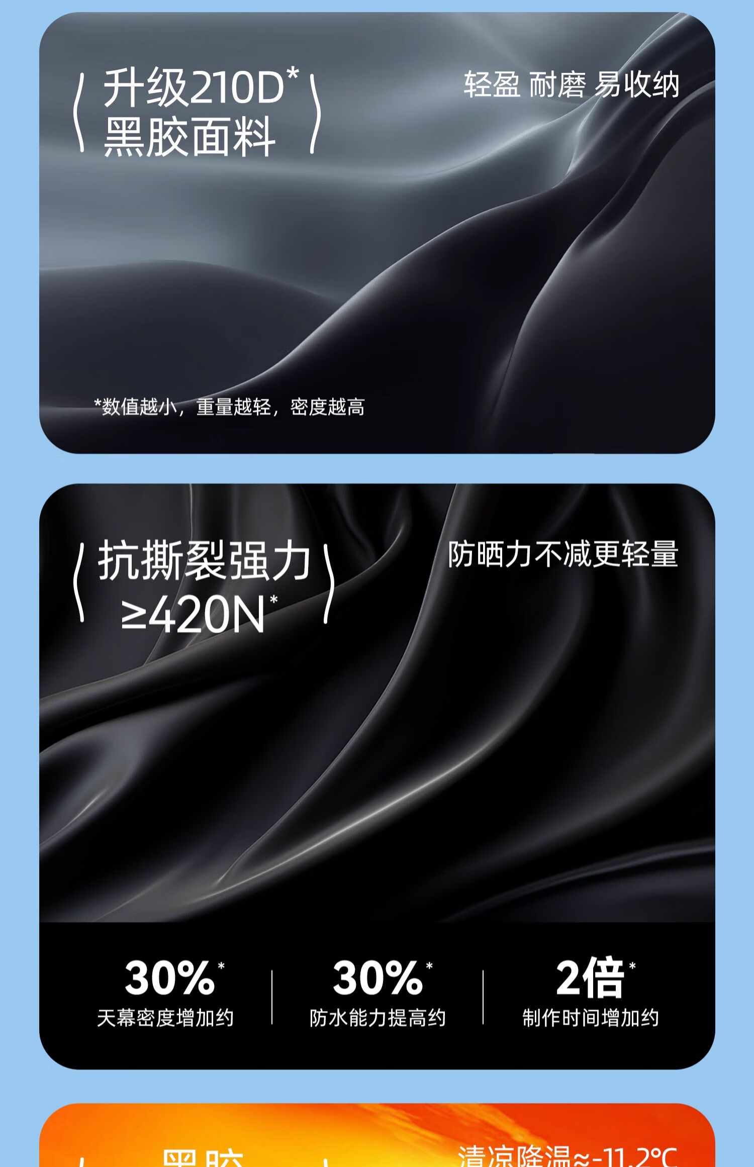 东西挺大搭起来挺宽敞哦,质量也不错 ,材质厚实耐用,店家服务态度很好的哦,高密度遮光,防晒更好,加粗加固防风绳,有效防晒黑防晒伤,安全防水防渗透。
