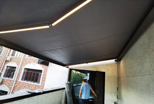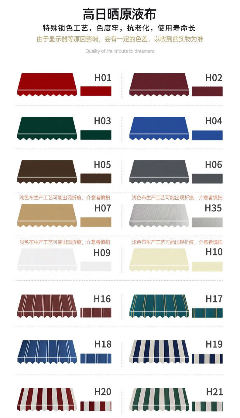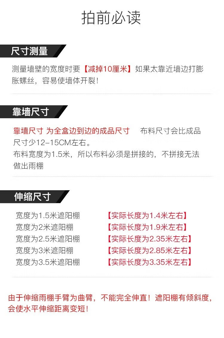 在京东平台看了很多家不同的品牌,最终选择了这家品牌的电动雨棚,宽度3米*2.5米伸 含灯带、遮阳板、升级进口布,订货一周后就收到货了,安装时出现了点波折,商家耐心认真的沟通协调安装,重新安排了安装人员顺利完成安装。电动雨棚经过测试达到预期效果。