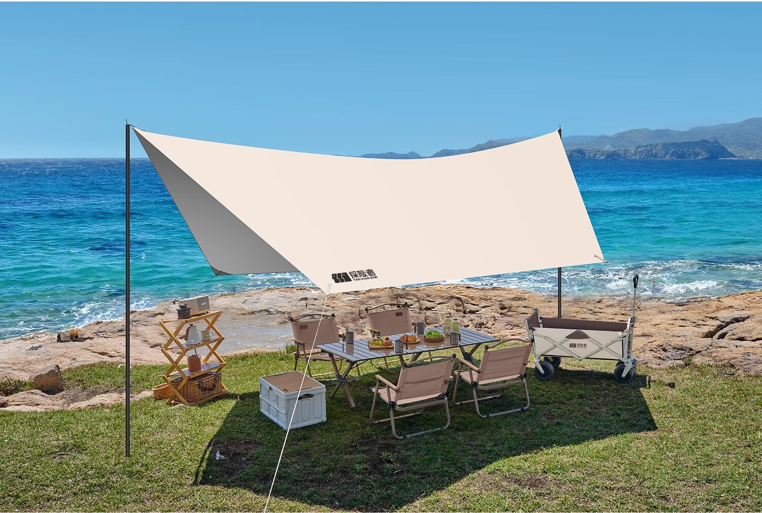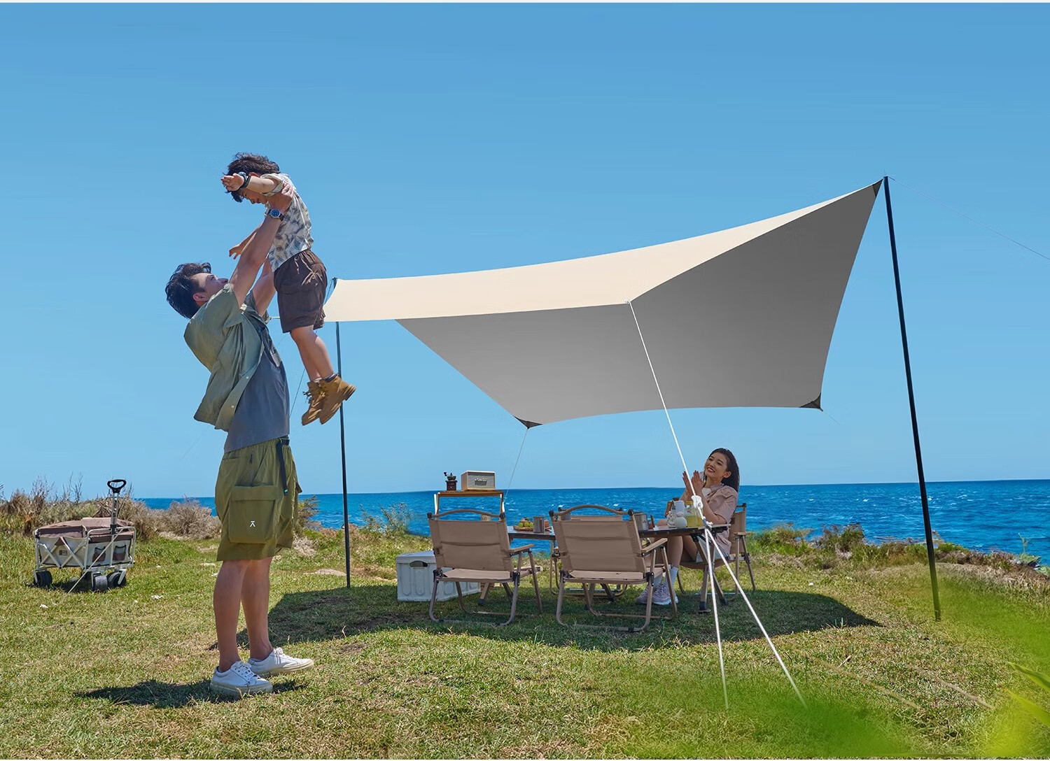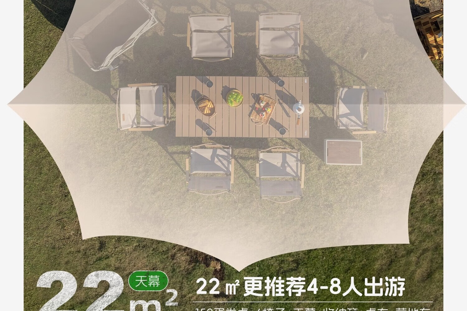 探险者天幕户外黑胶露营遮阳防晒公园聚会野营便携防雨八角蝶形遮阳棚 30㎡【黑胶天幕+蛋卷桌椅七件+后开推车】