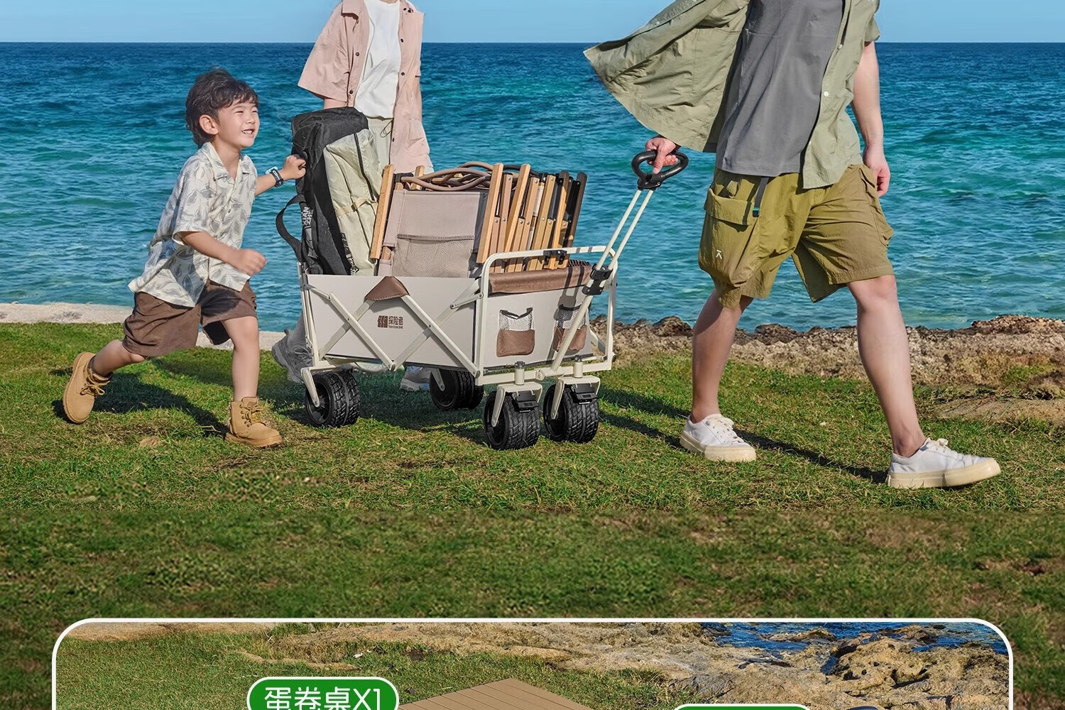 探险者户外露营装备全套七件套带桌板露营车桌椅套装可折叠收纳小推车 极光黑【万向轮】+野餐防晒套餐