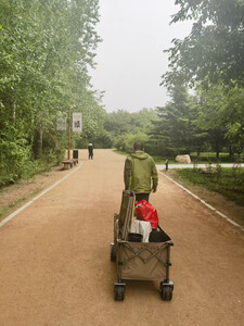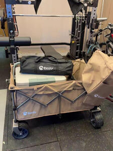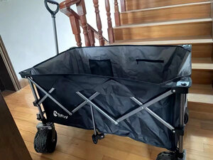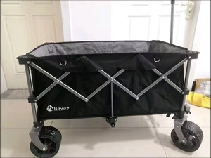 看到快递第一感觉就是很大,轮子可以用巨轮来形容,十厘米宽超级大的车轮,拉起来很轻松,收合都很方便,重量对于男生来说没有压力,车子展开后真的巨能装,超大空间,出去露营野餐拉装备绝对够用了,刚拆开包装牛津布稍有点味道,放阳台晾一段时间就散味了。