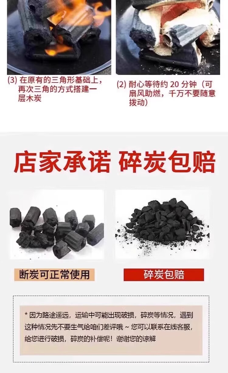 决定买了20斤试试。燃烧起来是没什么烟雾。就是点火的时候燃很慢,要烧一半,明火就旺了起来。能烧4-5个小时吧。价格优惠。也还好吧。