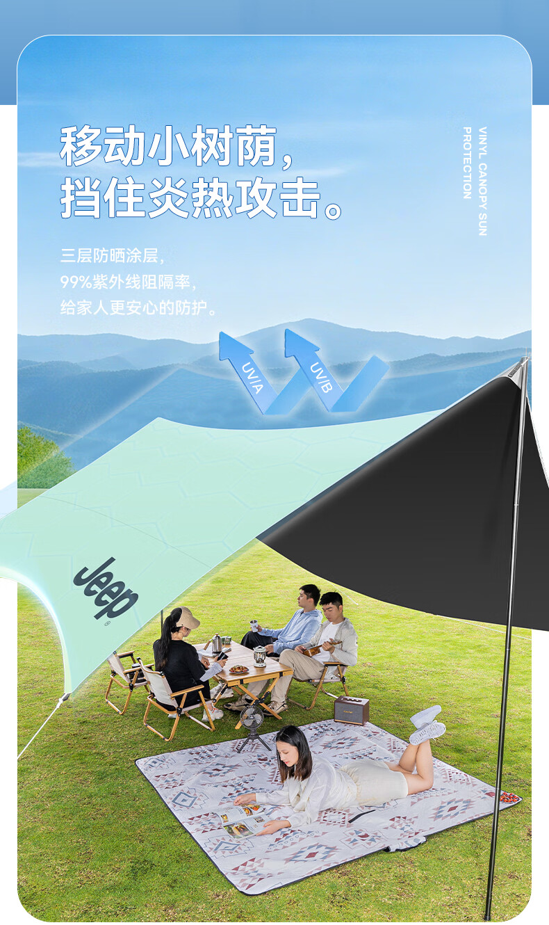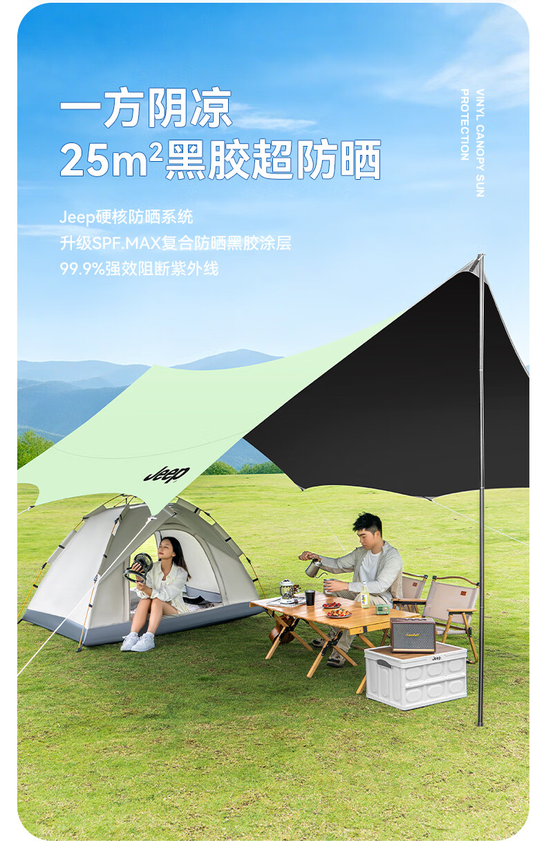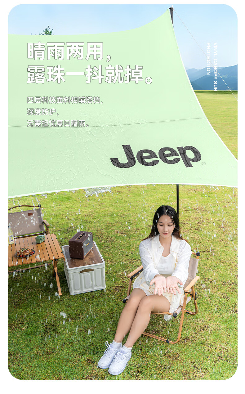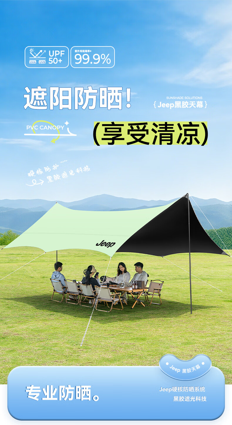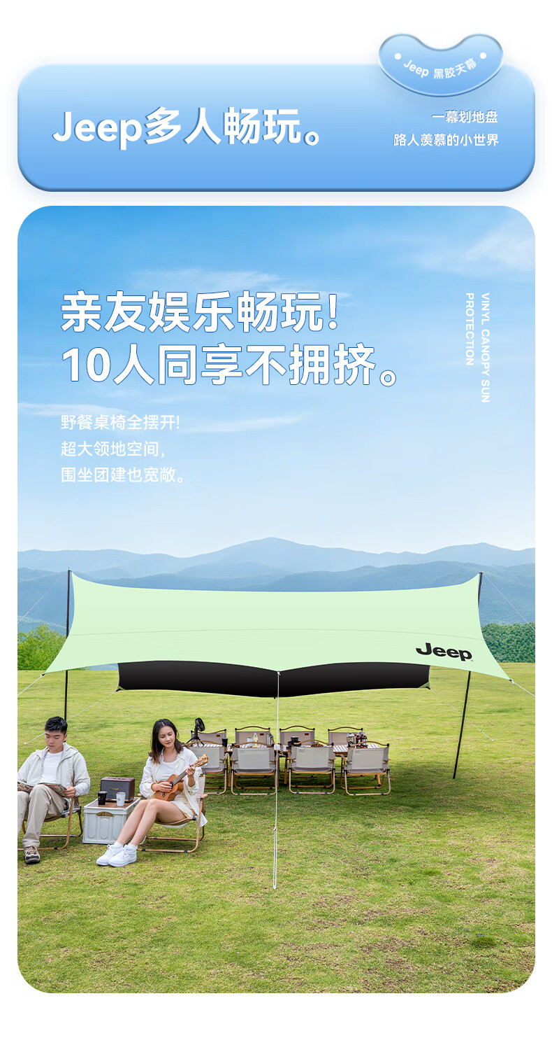 JEEP黑胶天幕户外遮阳防雨加强防晒沙滩津布露营凉棚雨棚蝶形帐篷天幕 13平黑胶蝶形防晒天幕【草木绿】