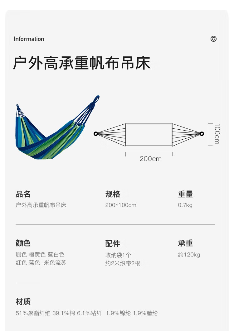 非常结实,绳子很防滑,承重能力强,非常耐脏,帆布非常结实耐用,非常喜欢,一直带出去野餐时玩耍,很有用,快递速度很是快。