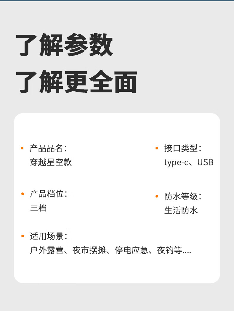 这款户外照明设备真的很实用,亮度足够,续航时间长,晚上在野外使用特别方便。星空下打开它,氛围感瞬间拉满,颜值也很高,携带轻便不占地方。充电速度快,防水性能好,雨天也能安心用。性价比超高!