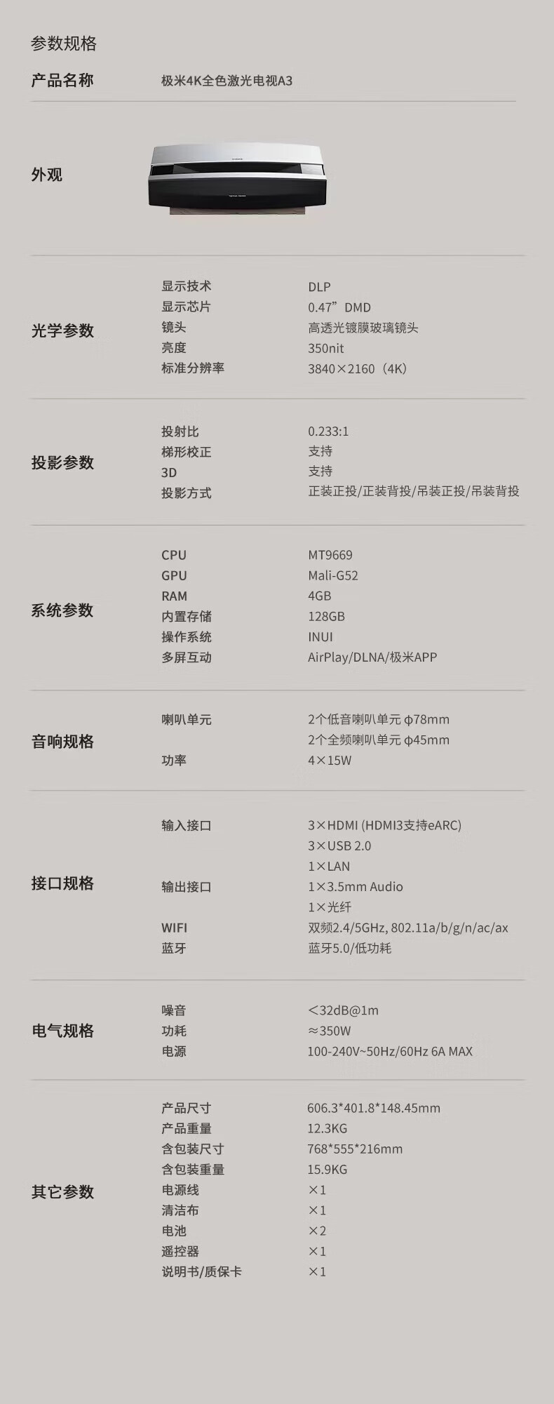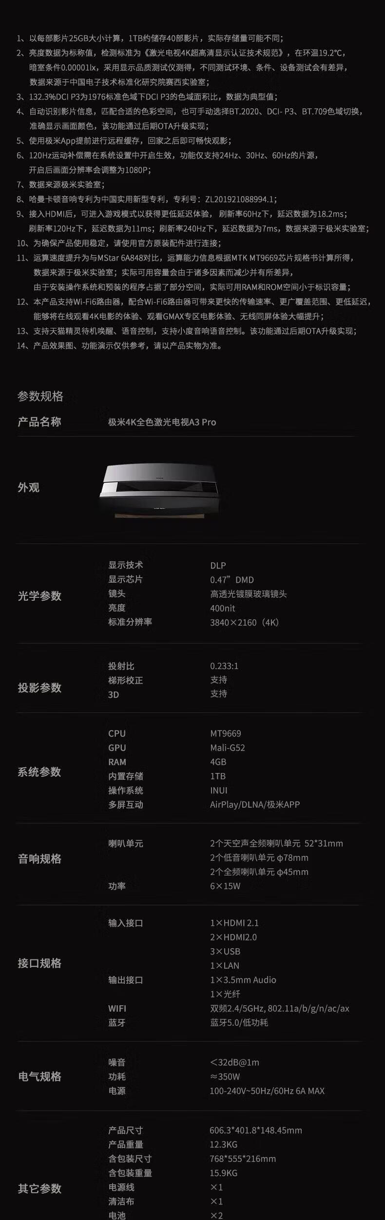 极米A3/A3 Pro激光投影电视4K超高清100寸120寸全色家庭激光影院客厅 极米A3 pro+进口高增益120寸硬屏
