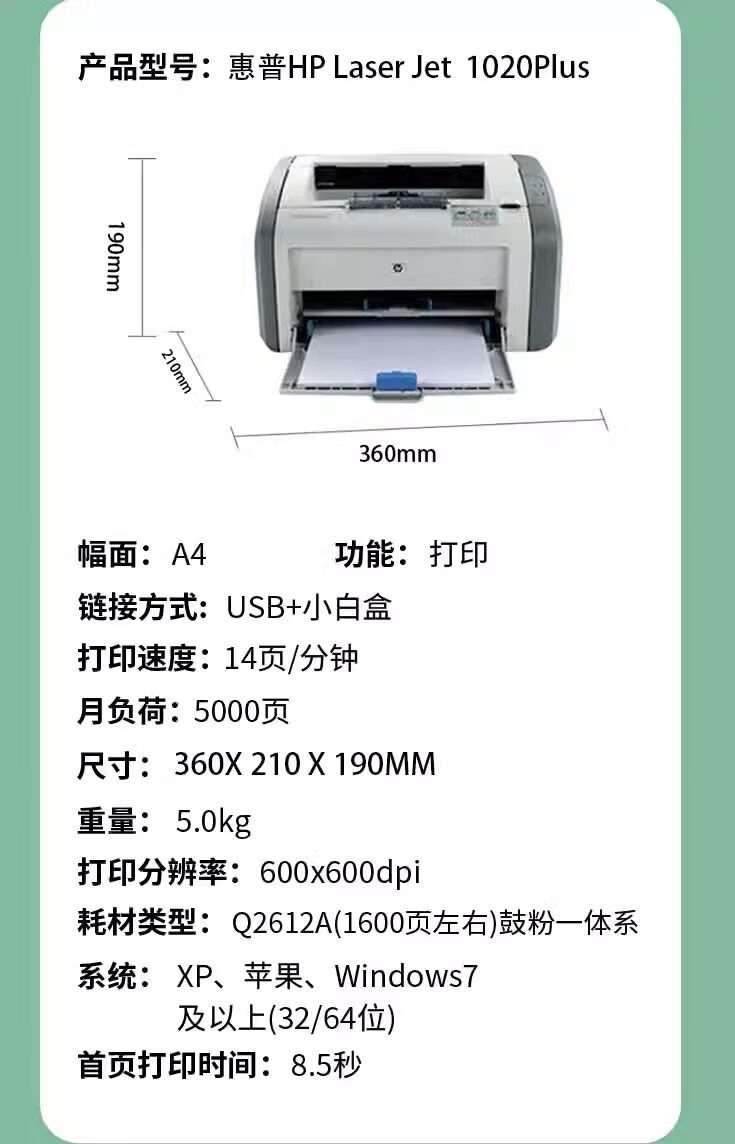 惠普(HP)1020plus/1108黑白激光打印机A4手机无线学生作业家用 【电脑打印】1010 官方标配