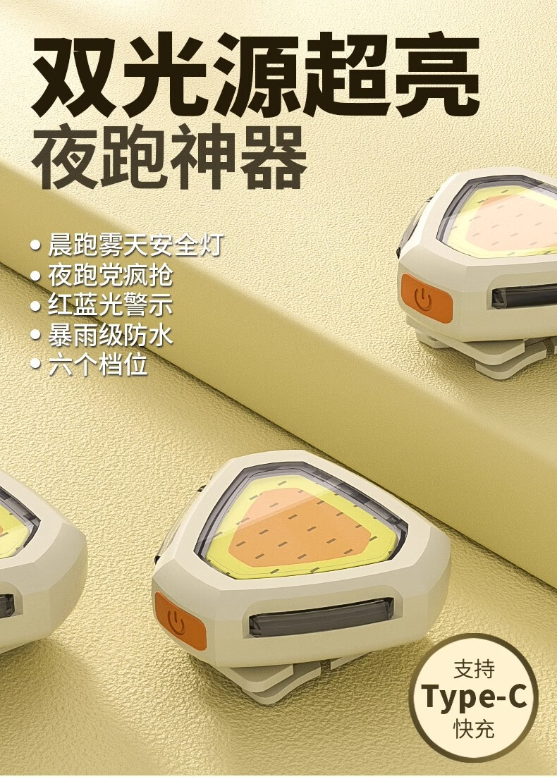 新款迷你跑步灯双光源充电式户外家用夜跑登山露营便携应急led灯 白黄双光源迷你跑步灯【普通版】 大泛光+头戴+帽夹+衣夹