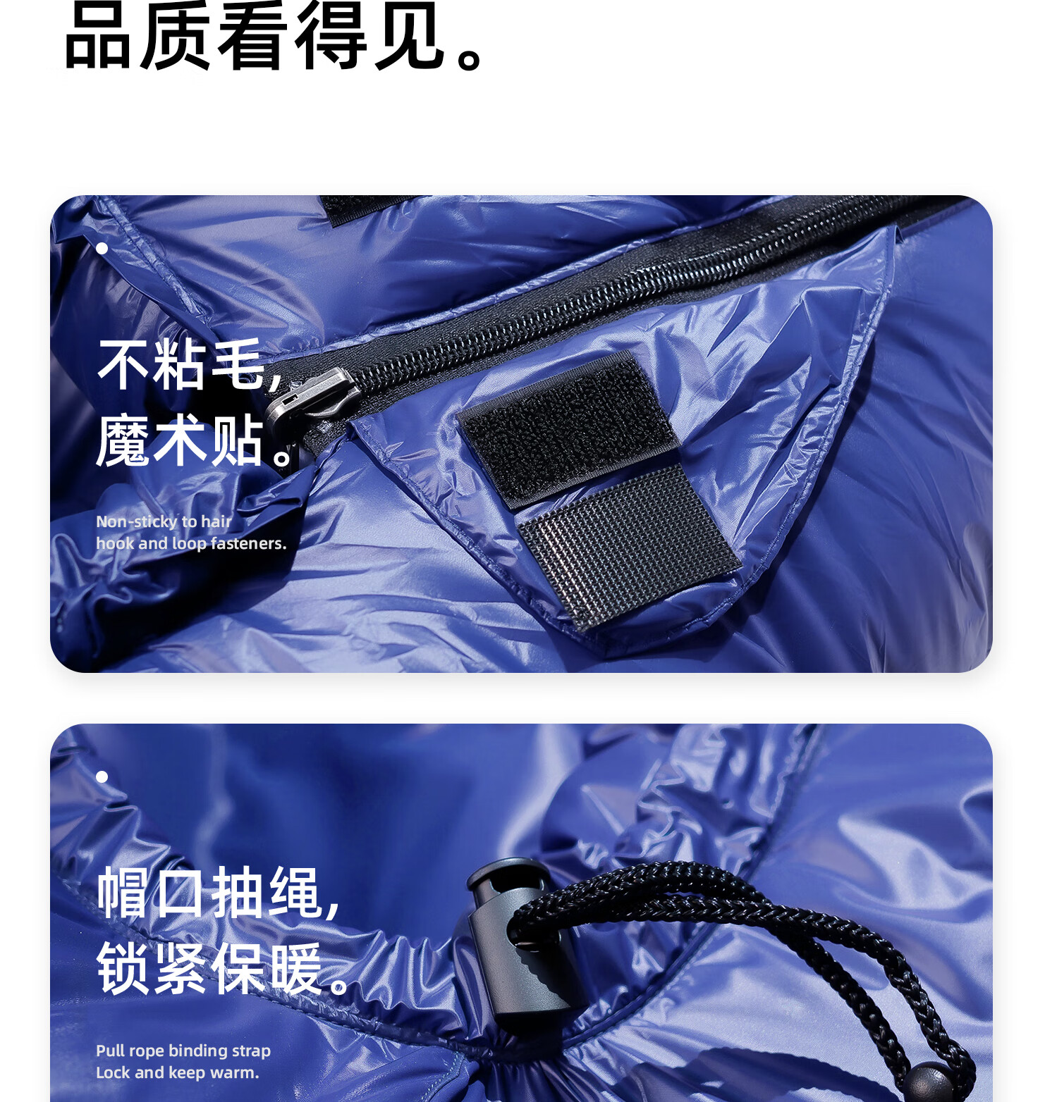 手感质量包装都超级棒!比想象中的大一些,真希望买之前能看看和同样量级的鹅绒的睡袋摆在一起时的大小对比照。