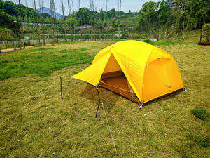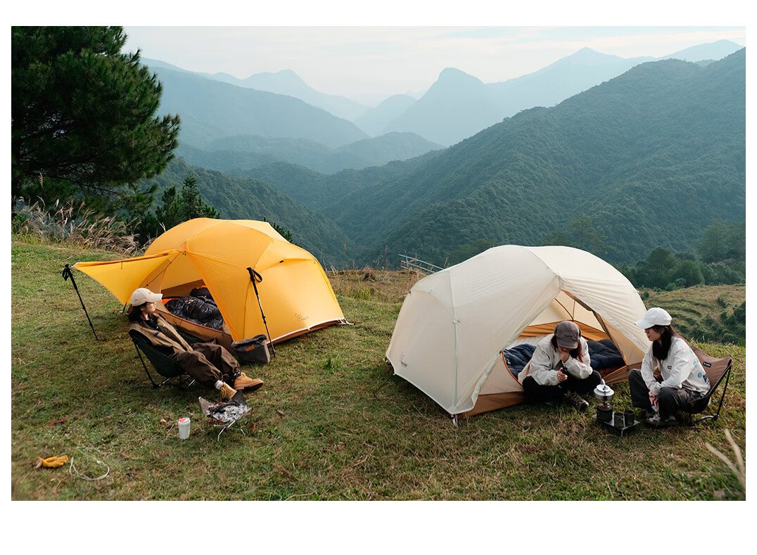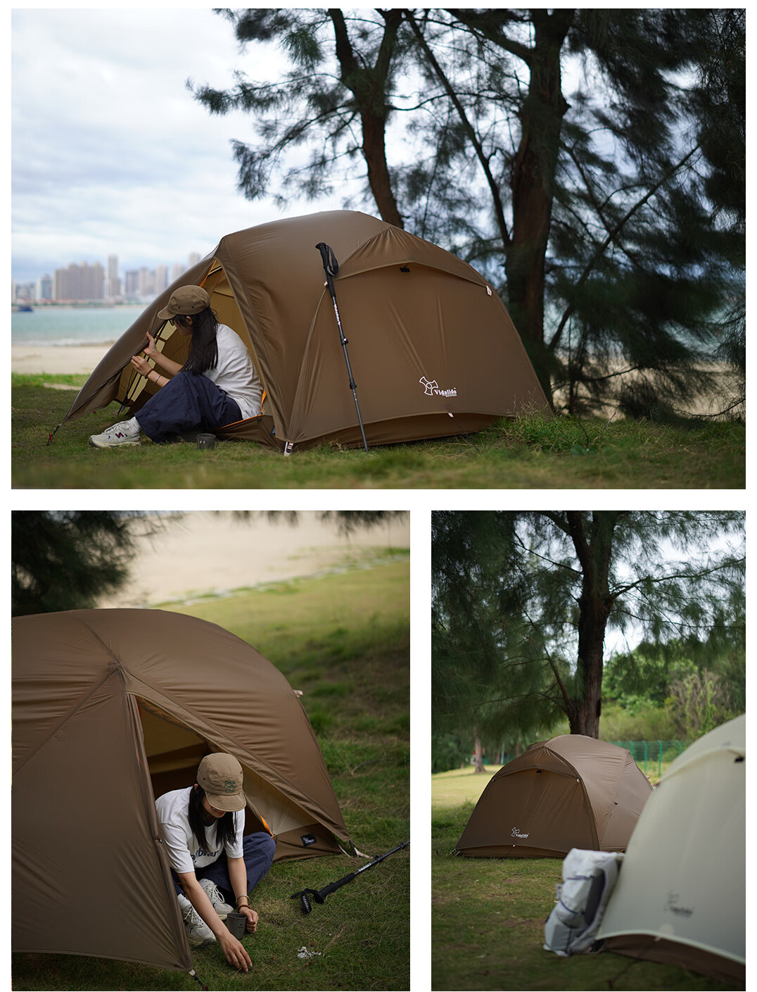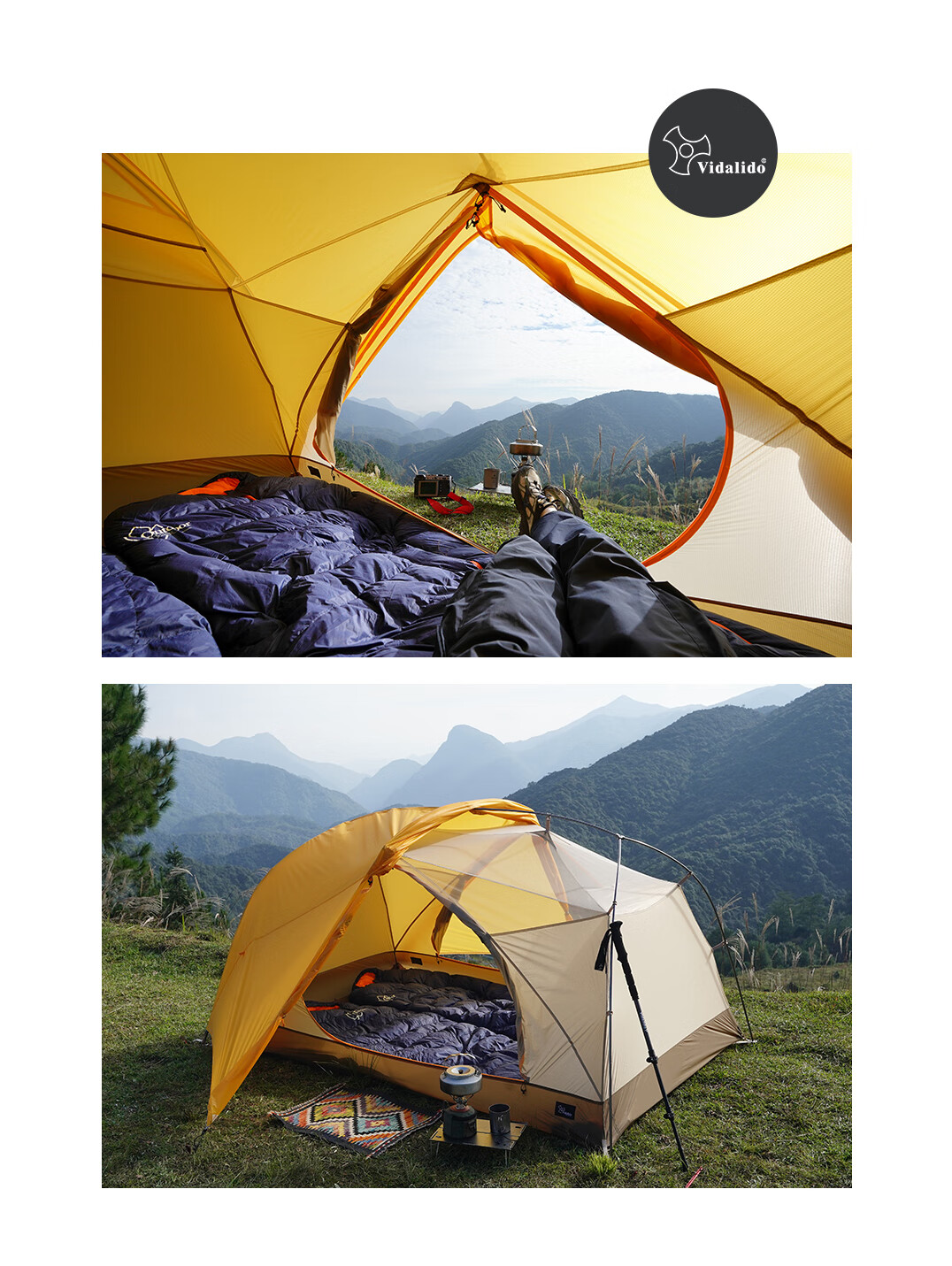 维达利多的徒步帐,目前很少撞帐篷,颜色很骚气,里面空间大,不顶头,适合两个人露营,一个人旁边可以放背包等装备,内外账夹缝空间也大可以放装备,门帘可以用两根登山杖延伸出小天幕,下雨天也可以做饭,总之很满意!