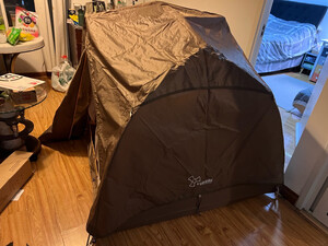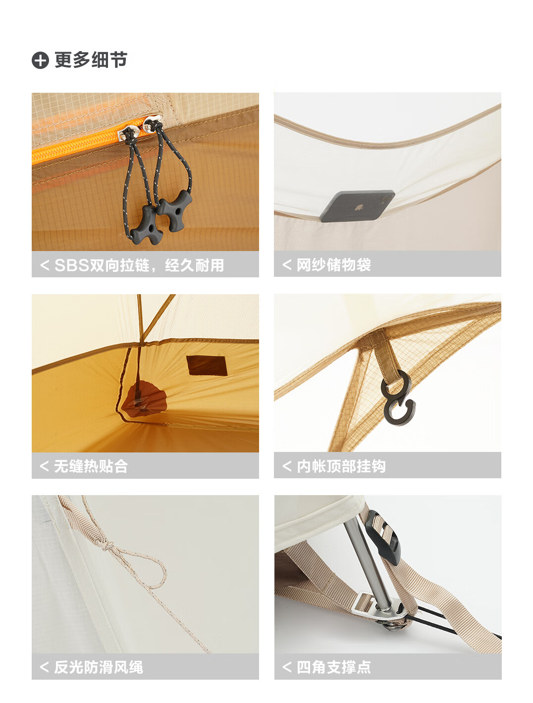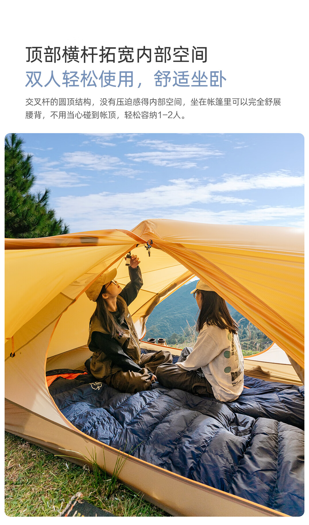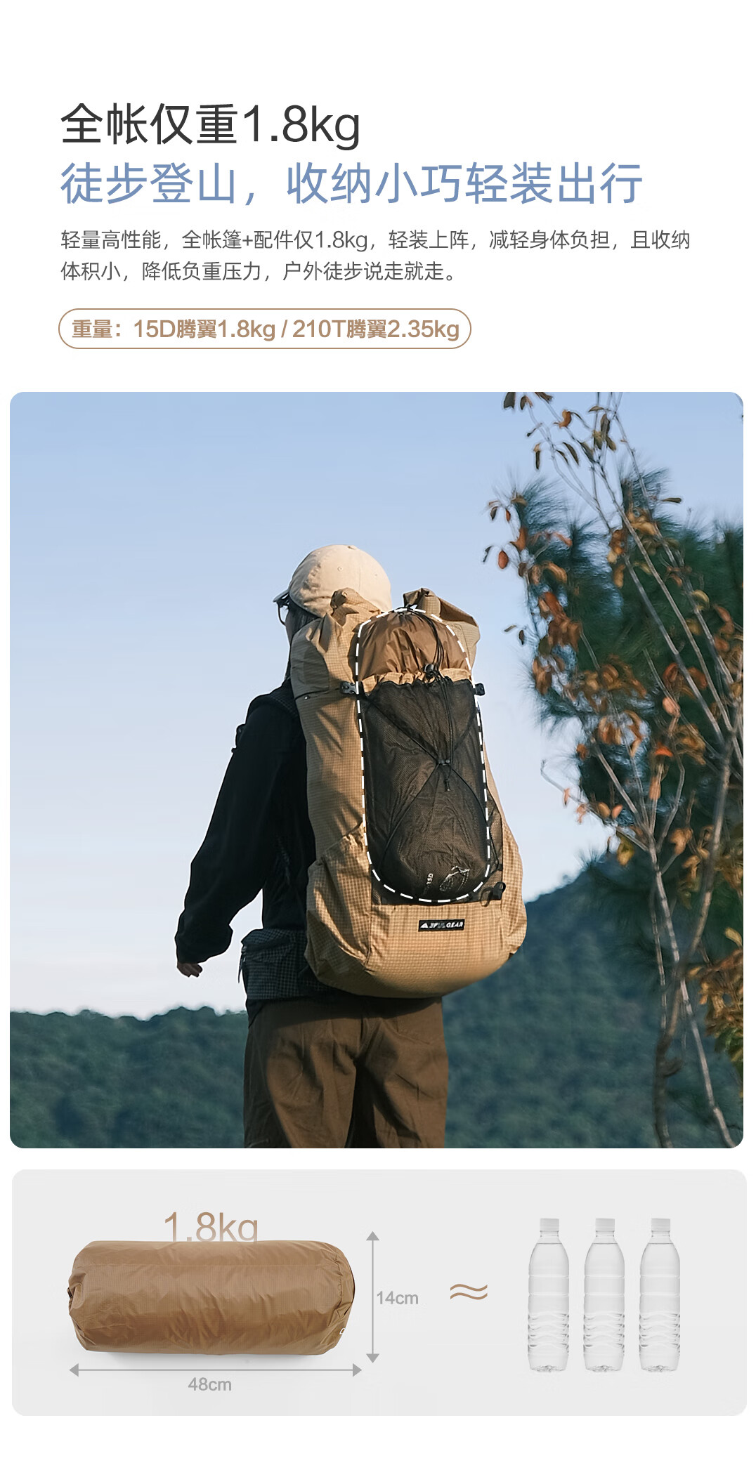 以前都是用大帐篷,搬家式露营出去真的太累了,第一次买徒步帐,这个很轻便,收纳小,面料不错,内帐设计有巧思,加高的盆地和平坦的顶部,在里面也可以活动自如,颜值不错。