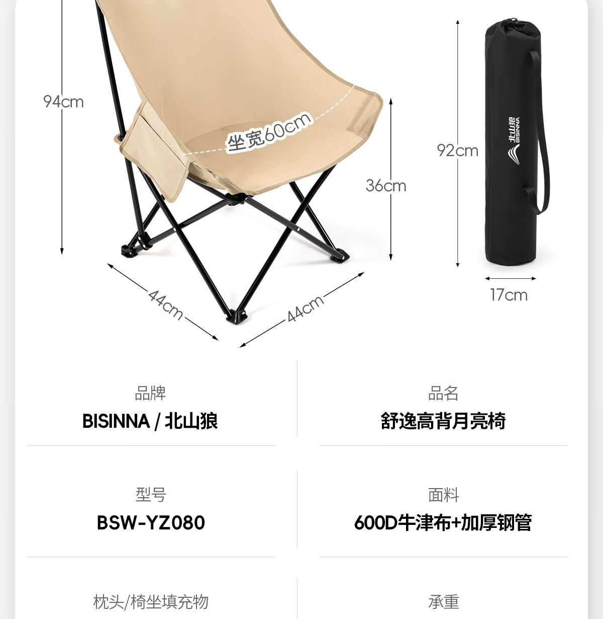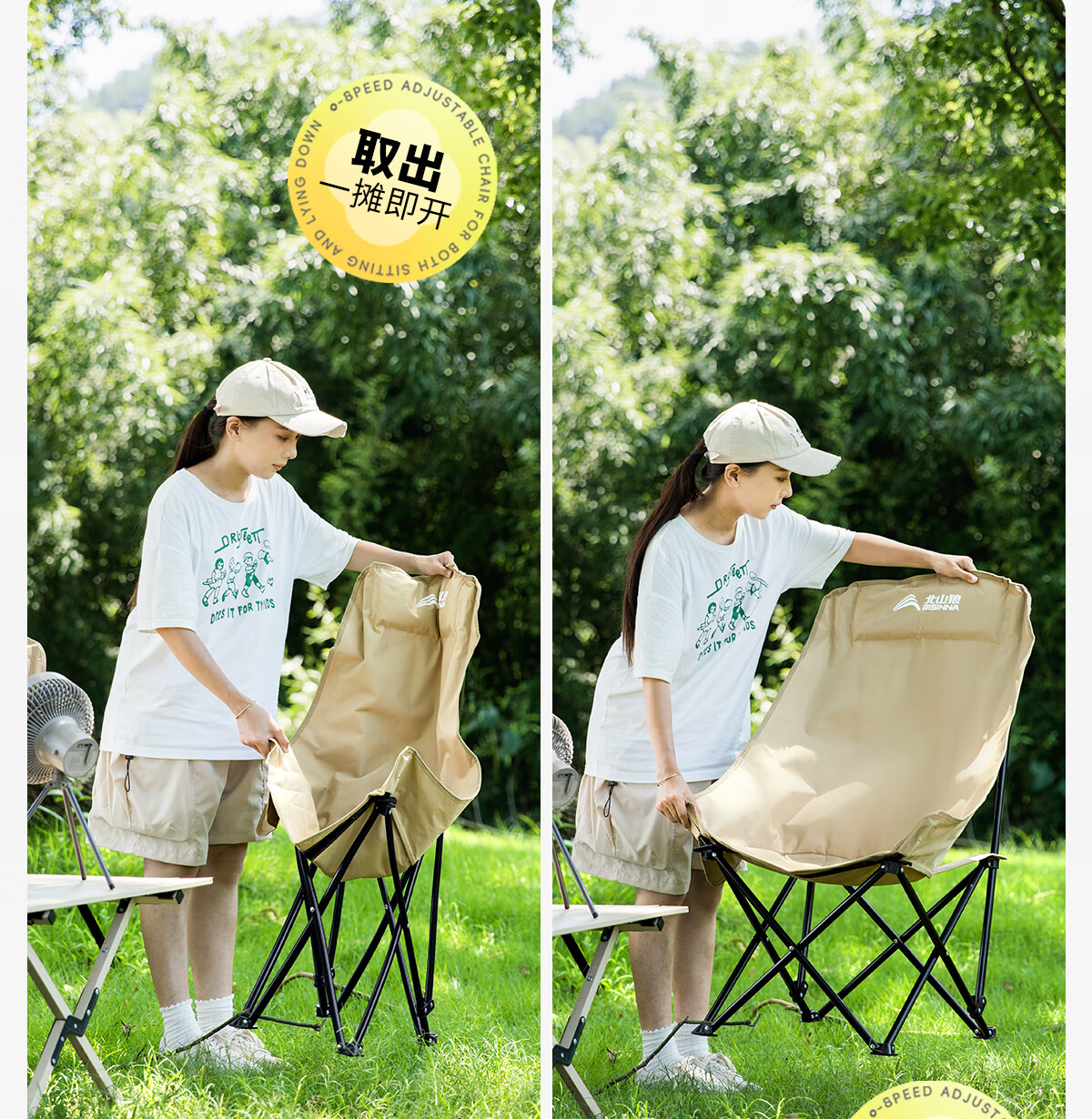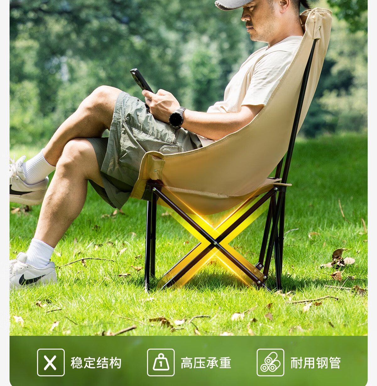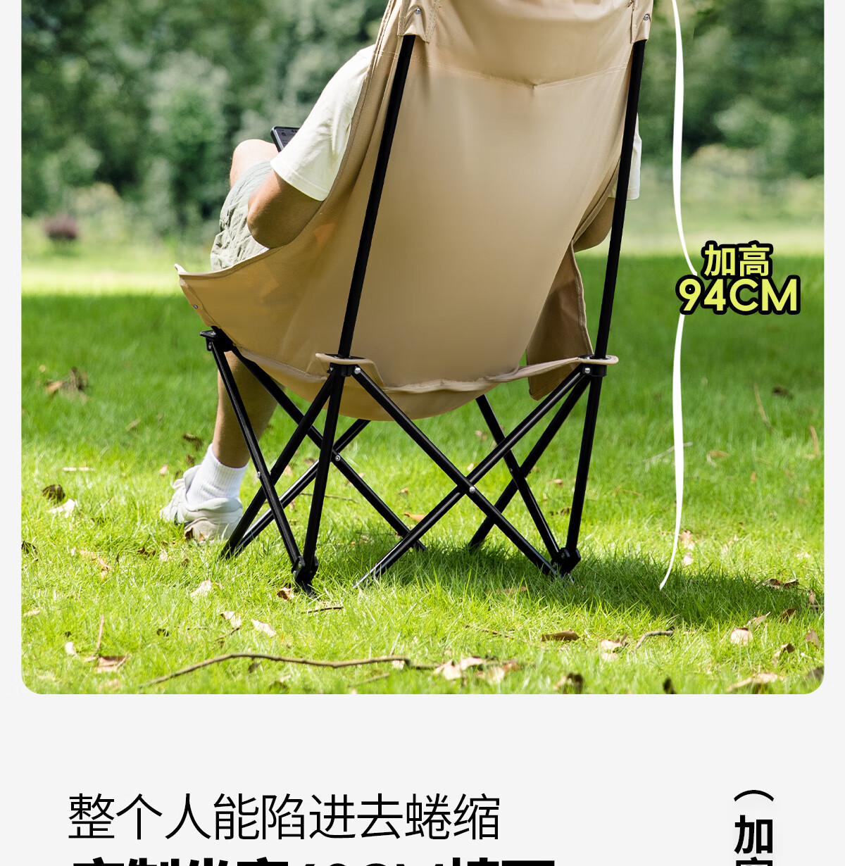 北山狼 户外折叠椅 加高靠背椅加厚钢管月亮椅露营折叠凳子便携躺椅 【加高加厚】— 卡其黄