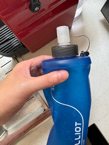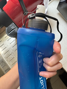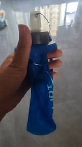 水壶上面有标注容量,英文LOGO显得非常大气,水壶喝水嘴有防漏开关,还有防尘盖子,水壶拿回来后用温水清洗后没有味道,接缝处做的还不错,跑步时拿在手上也非常方便。