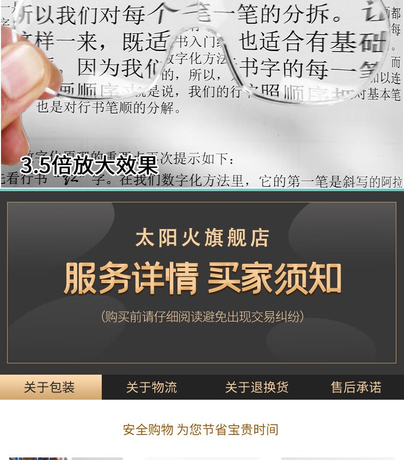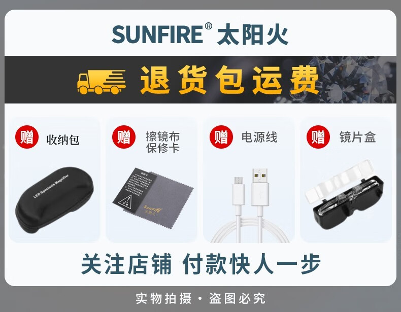 太阳火放大镜给了我一个小惊喜!物美价廉!原先想,这个价位恐怕好不到哪去,试试看。不料,一是很清晰舒爽,不象有的劣质镜!二是有三个镜片可以自甶组合,什么视力都能用,这个创意很好!就冲这个,也值了!美中不足的是重了点,我把照明灯拆下来就好多了。总之,值得推荐!