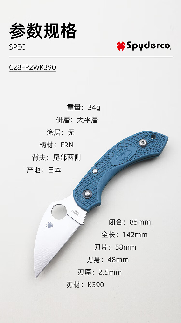 SPYDERCO美国蜘蛛C28FP2WK390蜻蜓Dragonfly便携户外折刀鸟嘴K390 C28FP2WK390 60°以下 85mm 4.8cm