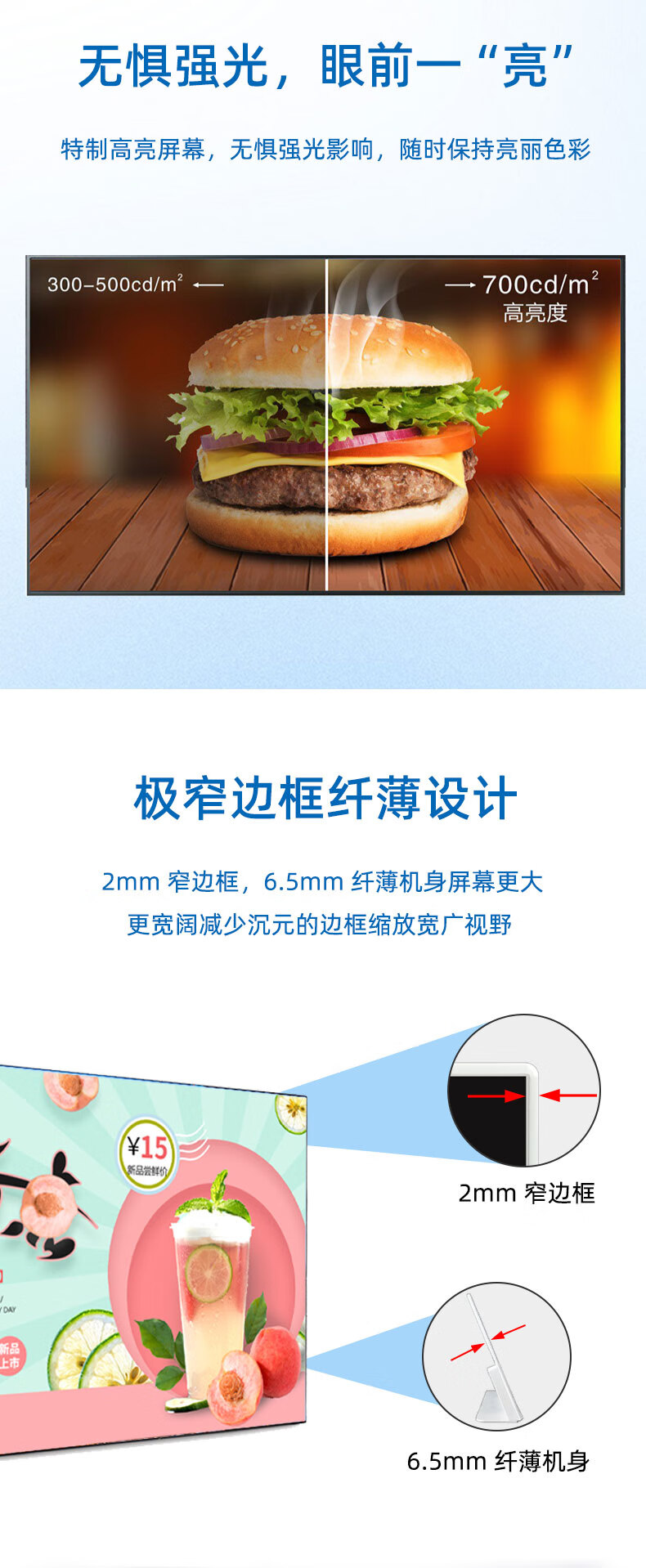 先买了桌面用的,使用起来方便,追加了2台吊屏,用一样的系统,很方便,亮度高就是不一样,看着色彩好看多了,使用了几天下来很满意,客户点单也方便!!!后续开分店会继续搭配购买。