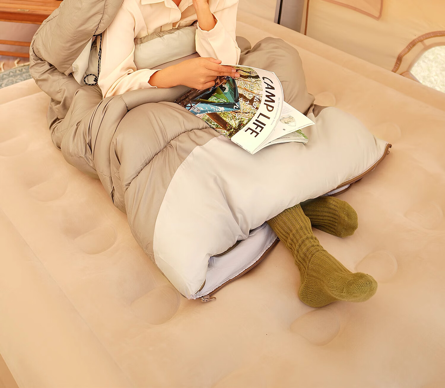 整个睡袋颜值非常的高,我非常喜欢这个卡其的颜色。质量也很不错,睡得很舒服,保暖性能也不错。整个还可以弄开来,看起来像个被子一样,客服服务态度也很好,也是非常耐心细心地回答。总之就是一次还不错的购物体验。