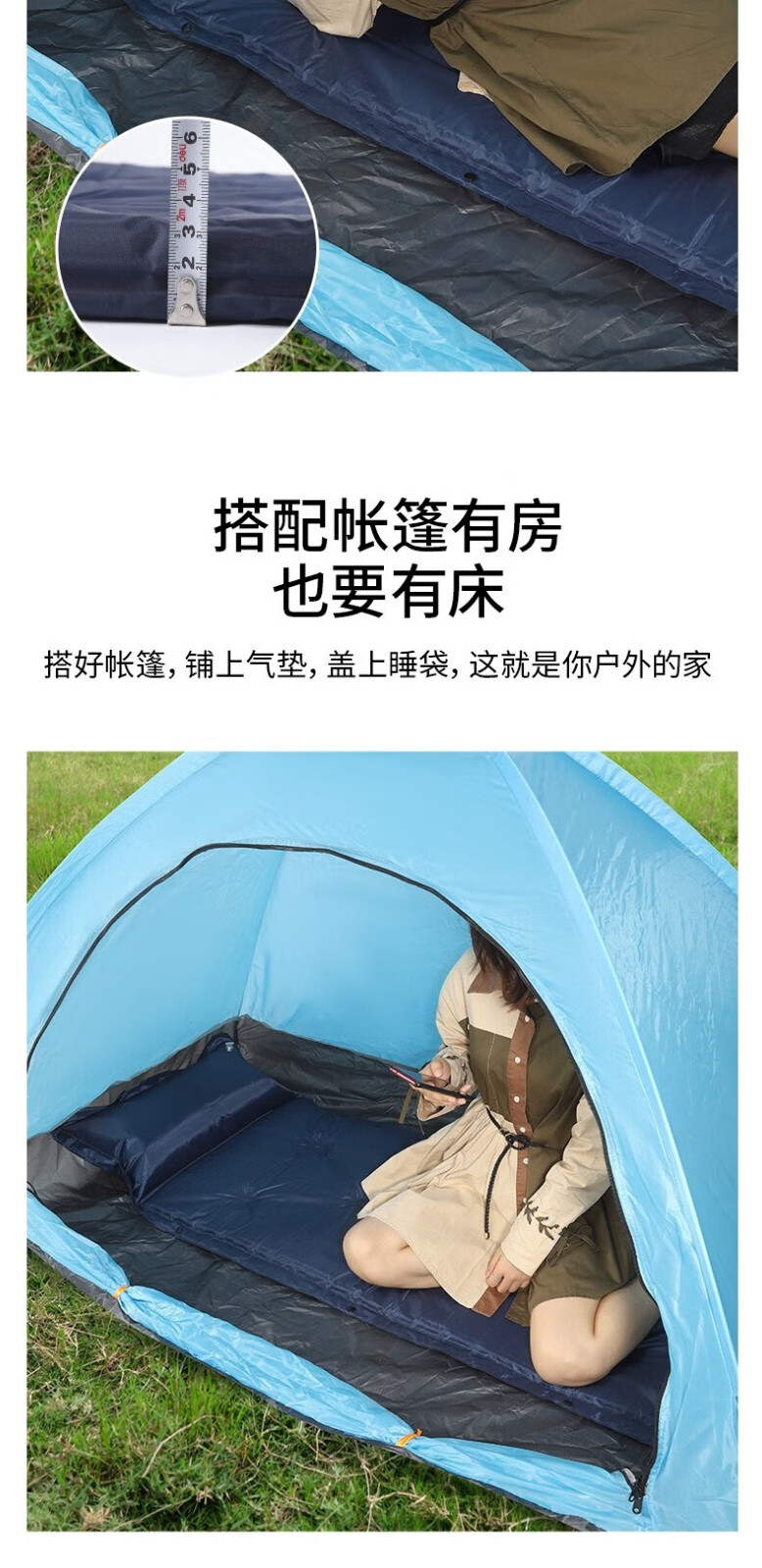 商品很好,自动充气厚度一般在3厘米左右,枕头吹气时候,要捏住吹气口柔软的地方,才可以吹进去,整体来说,适合个人,喜欢睡稍微偏硬的那类人,如果想睡比较柔软的,就买其它需要机器或者脚踩充气的充气垫吧