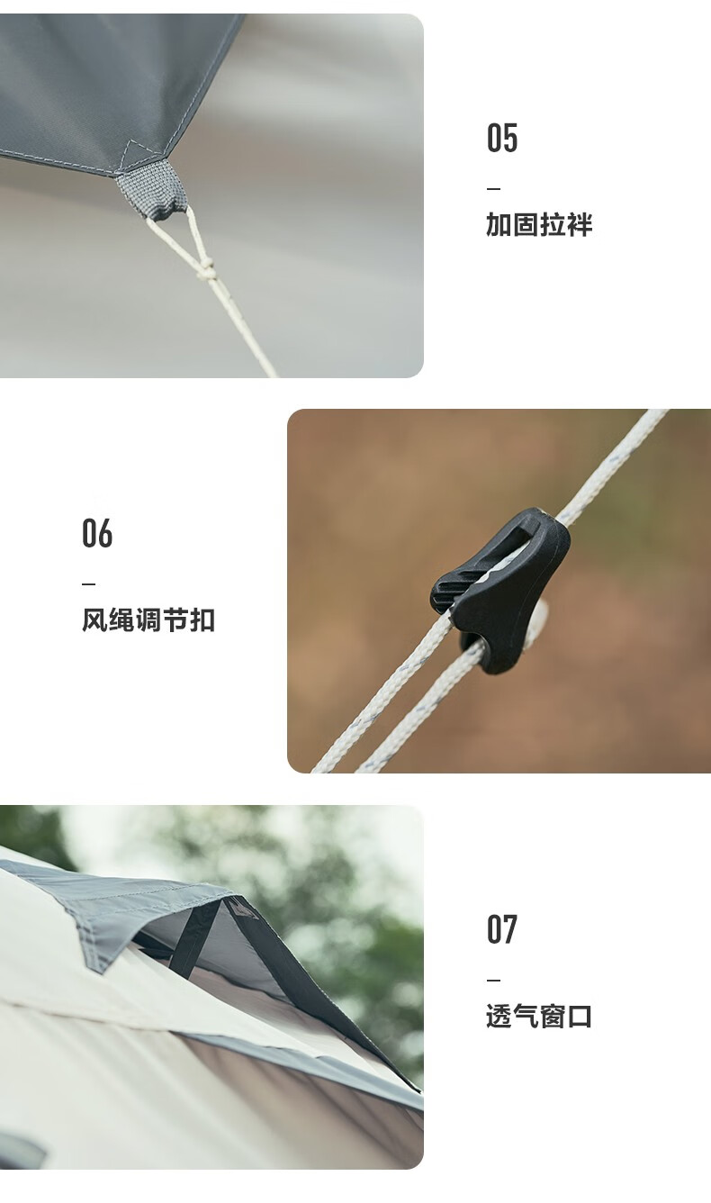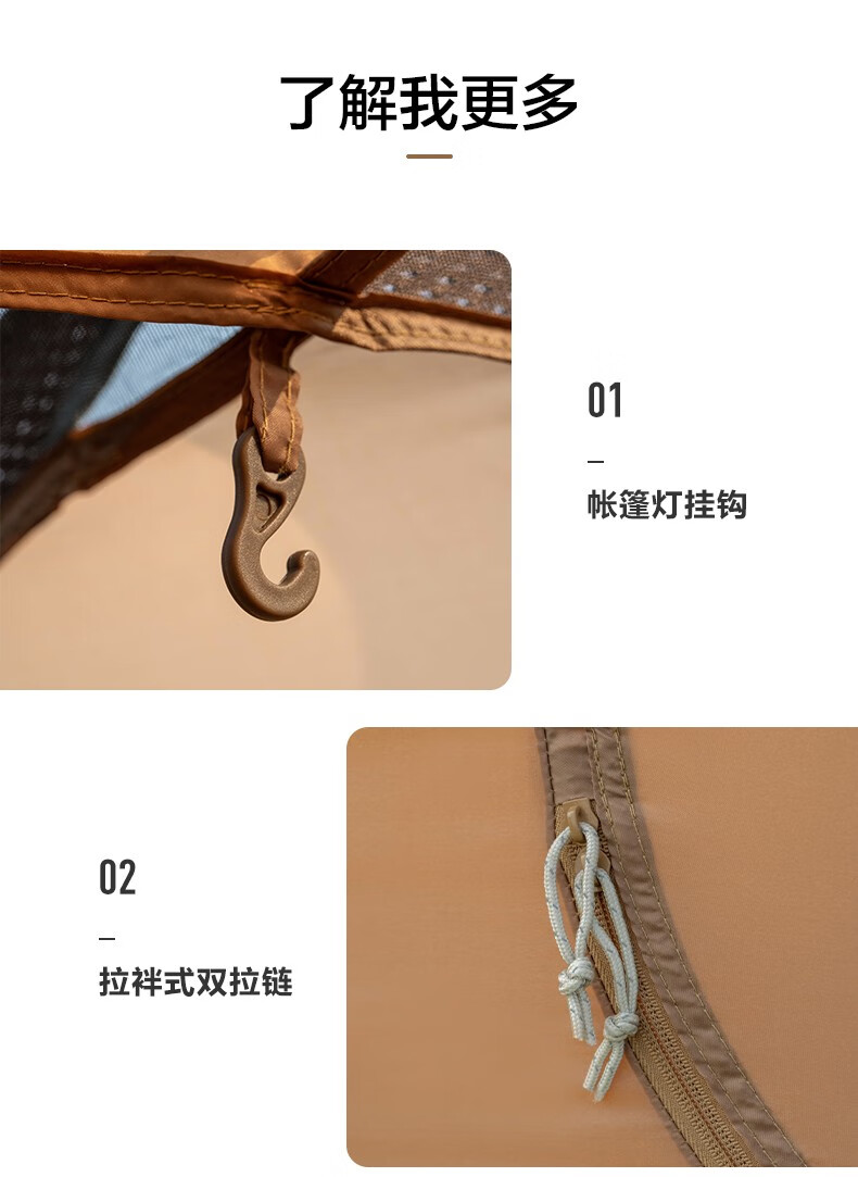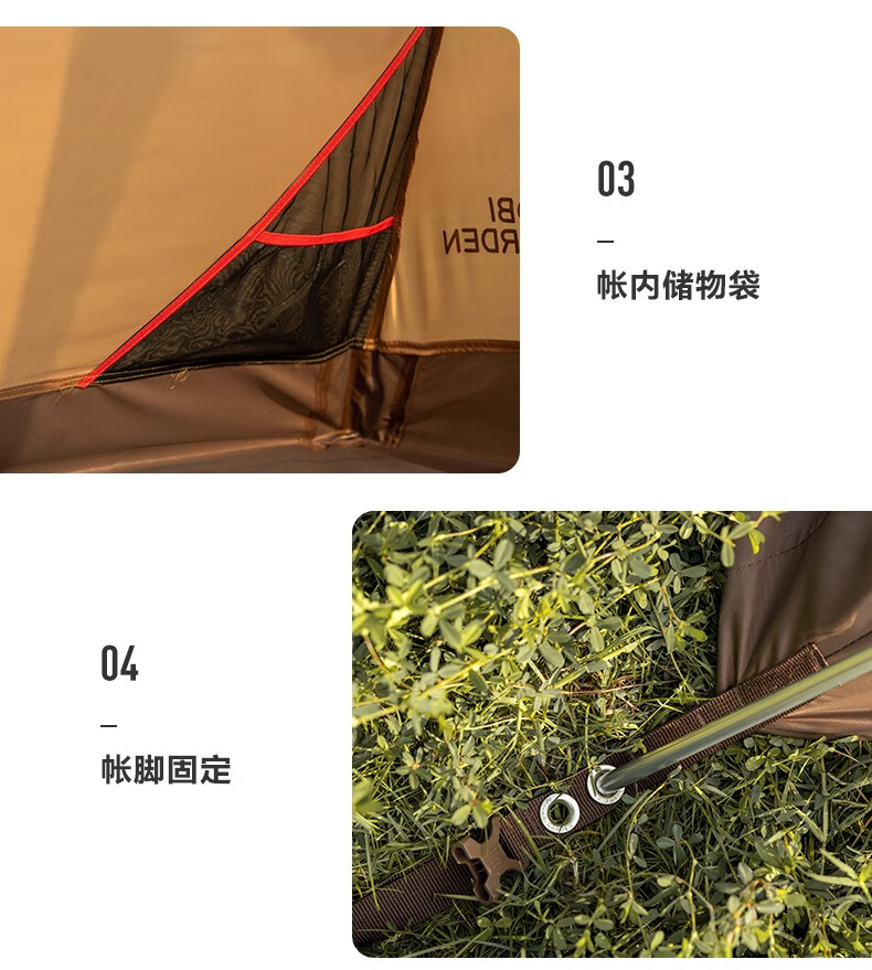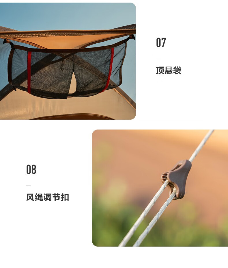 帐篷设计的非常细节,各种储物空间也是很合理,尤其是帐篷顶上的网兜,设计了两个独立的口袋,中间留出的空隙刚好可以将露营灯穿出,不影响光线照射,特别赞!不愧是专业的户外品牌,配套的产品也是性价比极高,会多多回购的