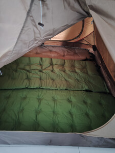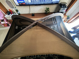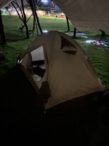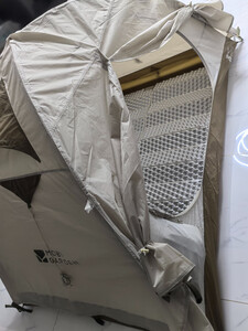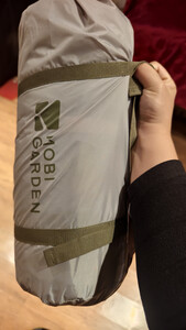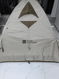 终于用上啦,傻瓜式搭法,搭起来特别简单,两个人十分钟就搞定,只要拉伸到尾基本不用怕下雨了,两人款两个成人+一只小狗都能睡,通风透气都还不错。
