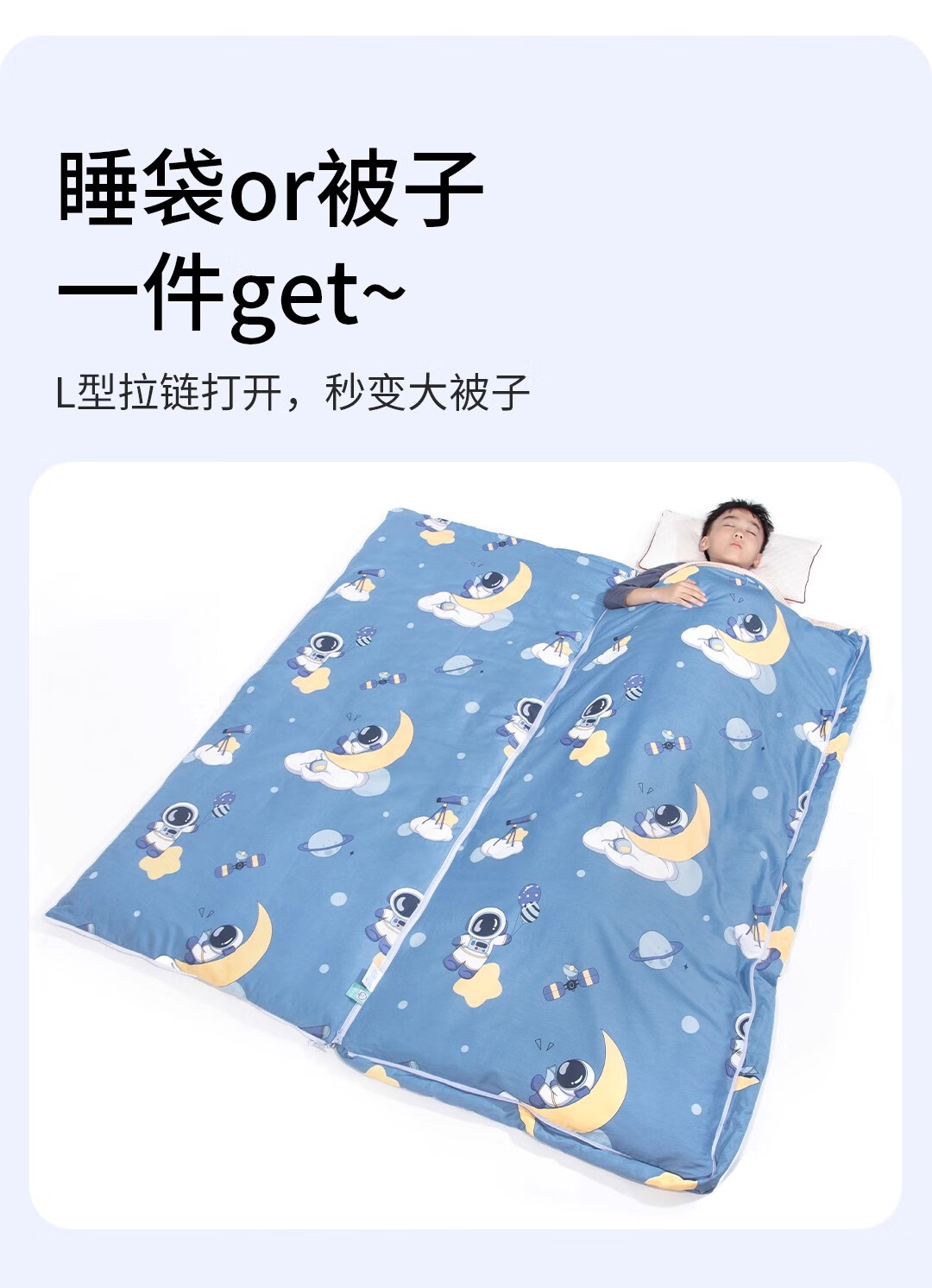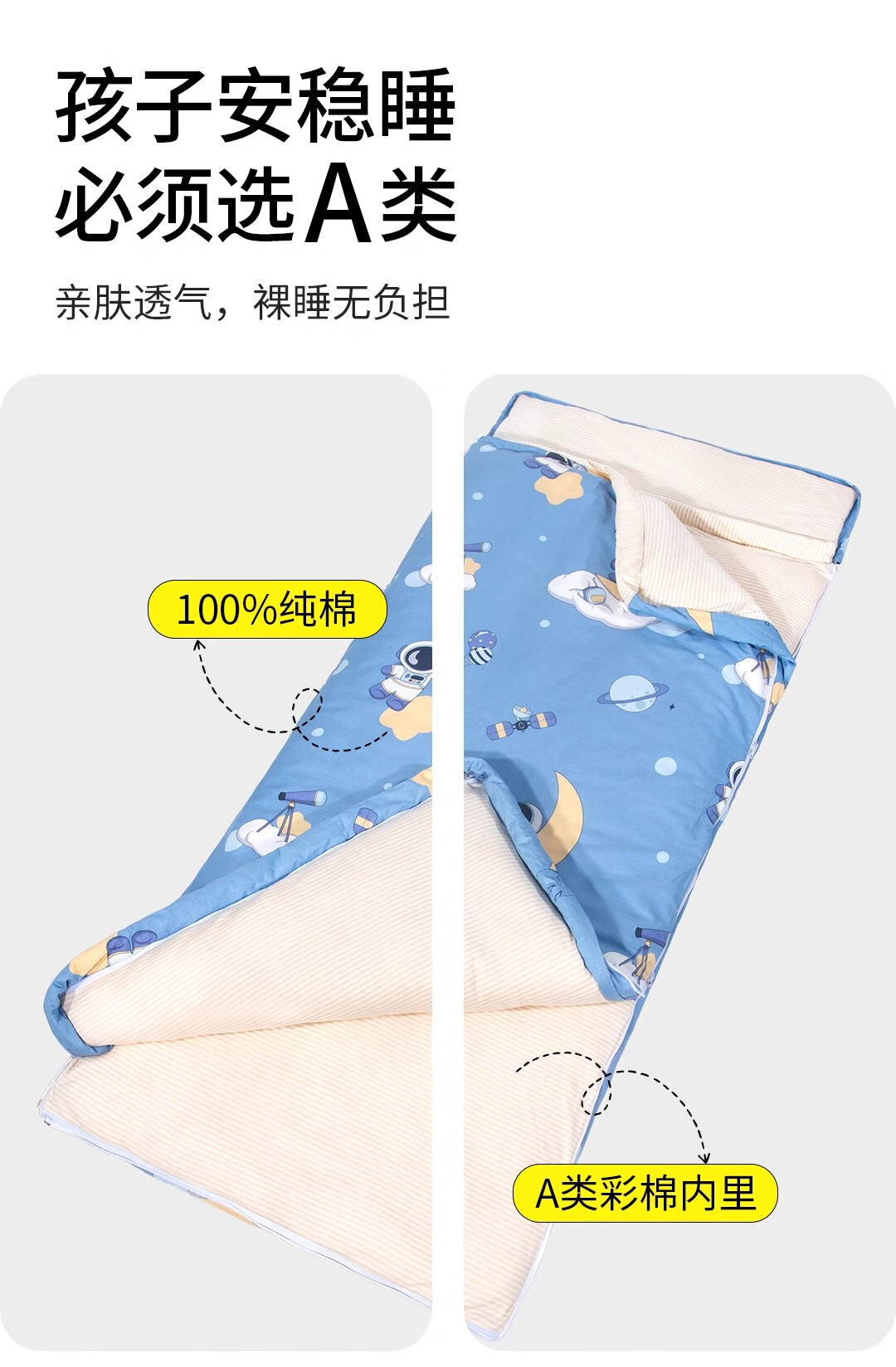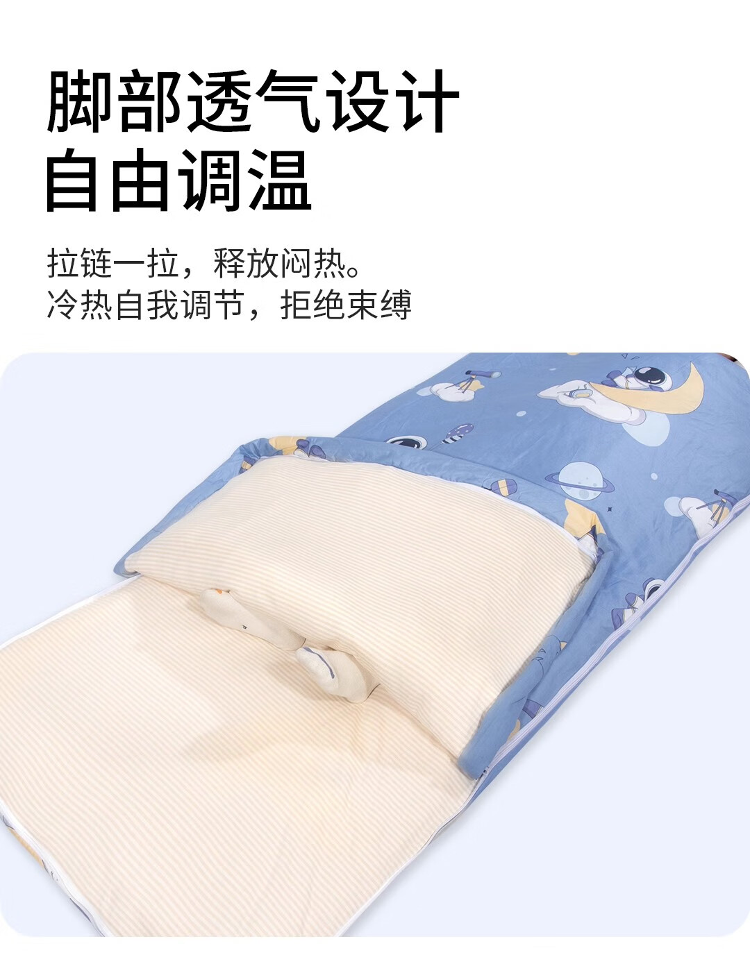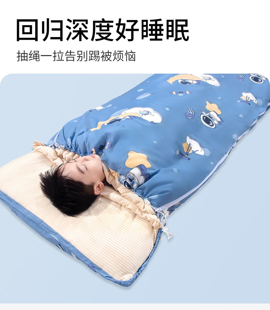 爱梦轩可拆内胆纯棉儿童睡袋护肩防踢被四季通用加厚小学生午睡大童被子 星球探月【被套+1薄1厚胆15~25℃】