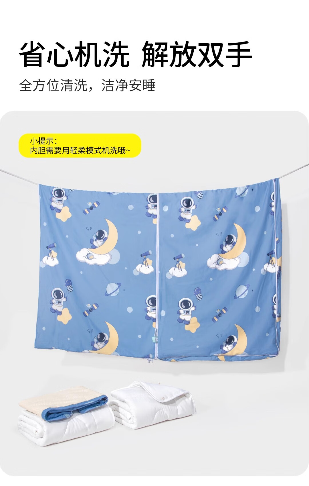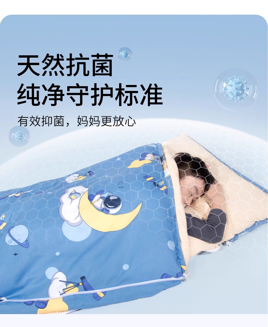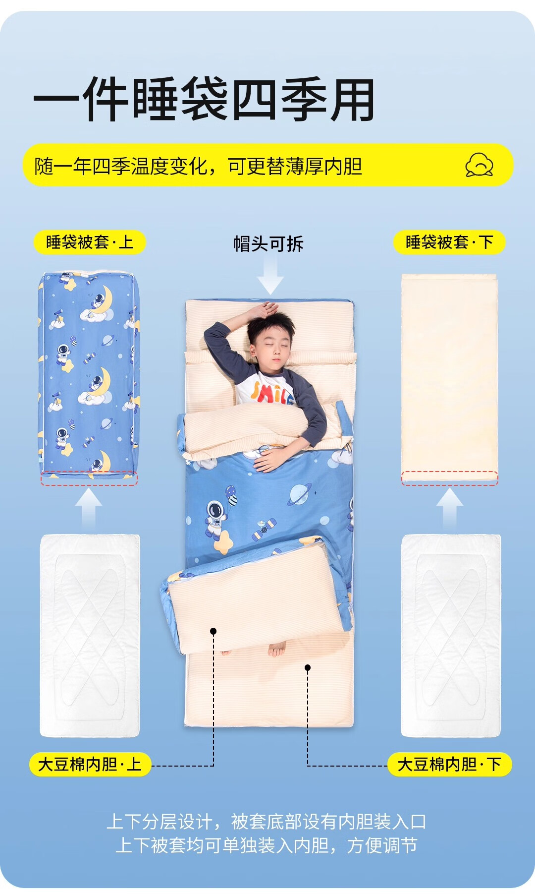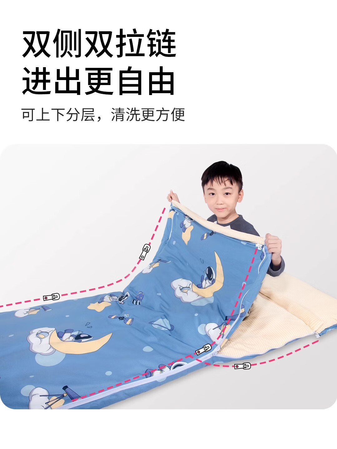 爱梦轩可拆内胆纯棉儿童睡袋护肩防踢被四季通用加厚小学生午睡大童被子 星球探月【被套+1薄1厚胆15~25℃】