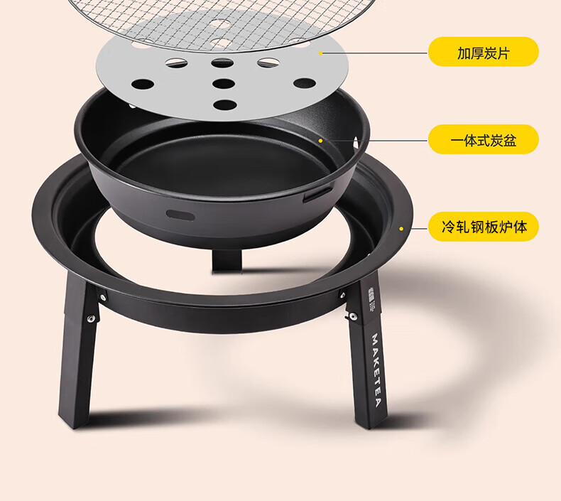 这个烧烤盘还行,好打理,如果给满分100分的话只能给80分,问题出在哪呢,比如:支撑烧烤炉子的三个架子底部应该弄个防滑垫!!!炉子在桌面上容易滑动。其次支架回折关节部分,不牢靠,轻轻用点力就能回折,这个设计有好有蔽!!!在使用的时候一定得注意挪动的时候都容易回折!