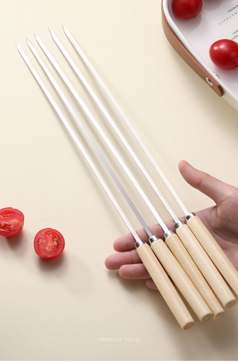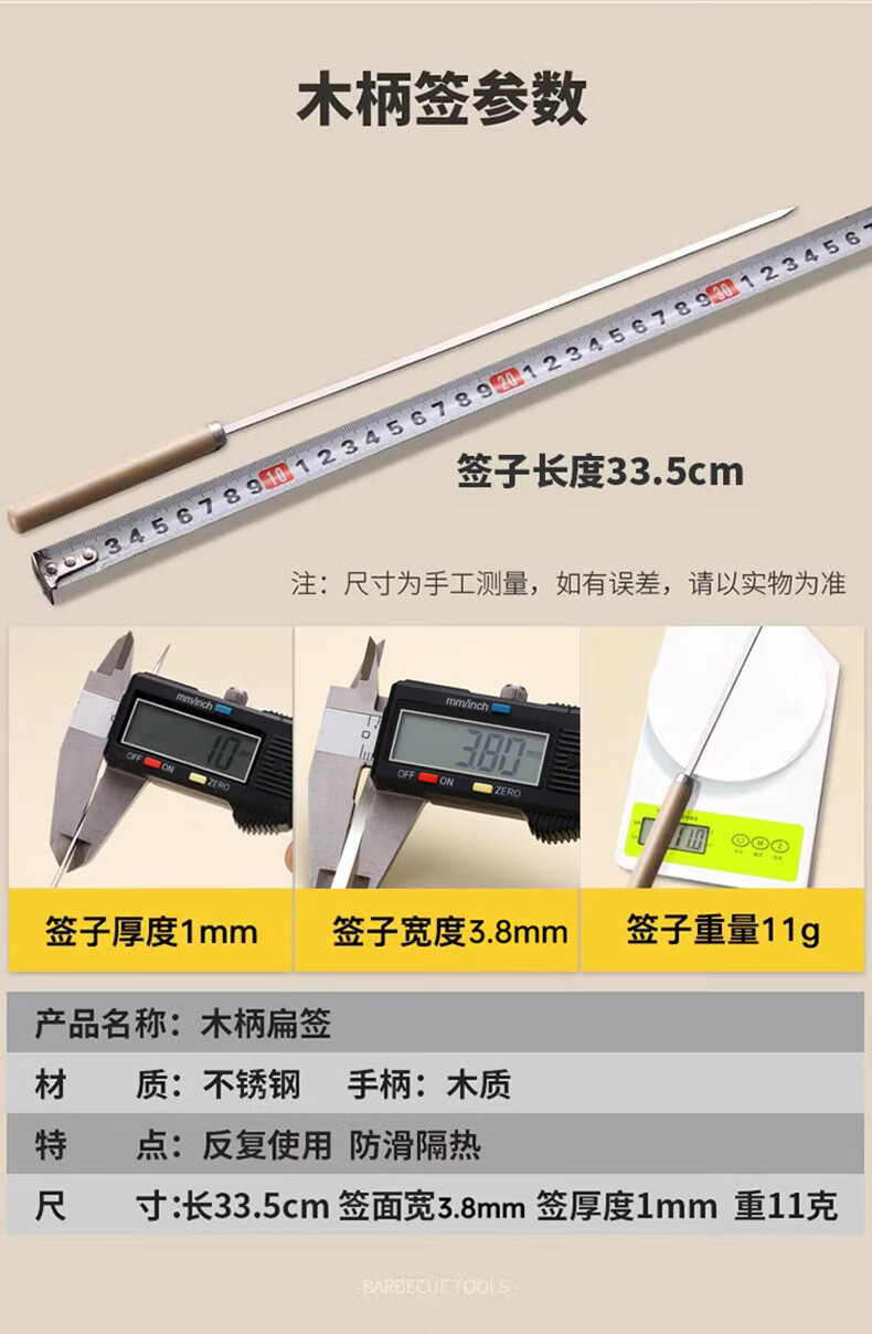 原始人木柄烧烤签子不锈钢羊肉串烤肉烤串工具钢扁签铁签字针用品 长33.5cm*宽4mm*厚1mm 40支