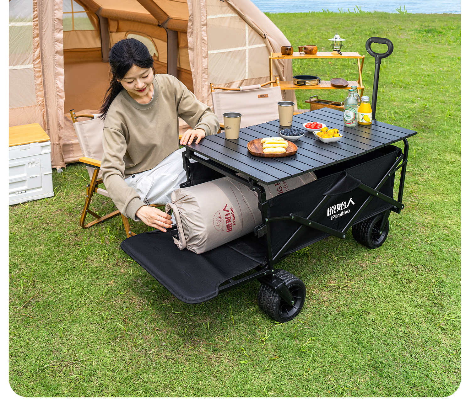 原始人露营推车营地拖车户外折叠旅行手推野餐小推车野营遛娃快递手拉车 250L 桌板套餐:加大款卡其+桌板