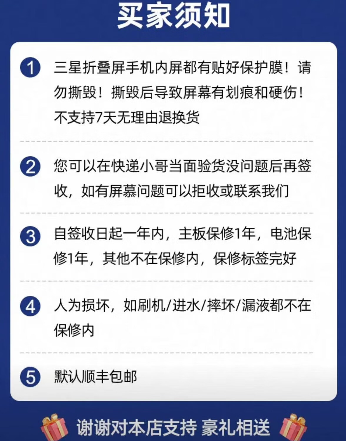 --请认真阅读以下内容-- 手机外观成色 99 新 无划痕 0瑕疵 属于二手机5G 双卡双待 心系天下国行系统运行顺畅 操作丝滑内存信息 16G+1TB 无法修改,请以套餐信息为准。 三星欧版 Fold4/Fold5 升级心系天下 W24/W25 外观(是由Fold4 通过换边框和后盖来实现模仿 W24/W25 的外观完美升级国行 w25 系统) 1、改装和原装的区别原装是三星正品出厂的,举例 w25 他是三星官方原装的正品具有全国联保以及享受相关的所有权益,改装的利用fold4 等机型通过个人换壳模仿的外观和原装机不是一回事,当然价格也不是一回事!! 2、关于售后服务是如何履行的 君子交易坦荡荡,丑话说在前避免事后有纠纷以下就针对改装机的后续售后服务做出详细说明,改转机经过个人的拆装已经失去了三星官方保修资格只能店铺质保