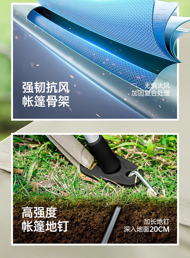 帐篷很方便,轻轻松松就能撑起来,一个人也可以,搭配有地钉和防风绳,;里面空间大,有网纱,顶部也是透风的,充气床垫方便快捷,在家先体验试试。
