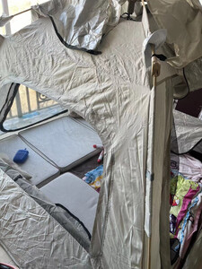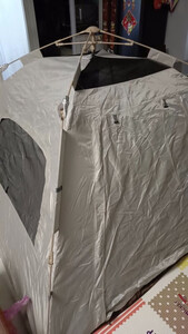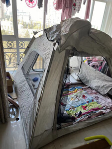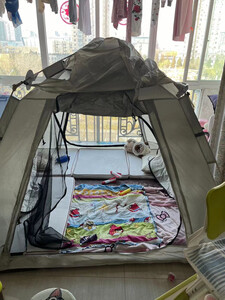 两门两窗帐篷平时放在阳台给小孩玩,虽然有点挤,但是撑开收纳都很方便,铺上垫子就是小朋友的玩具屋;帐篷带有网纱和门帘,等周末出去露营。