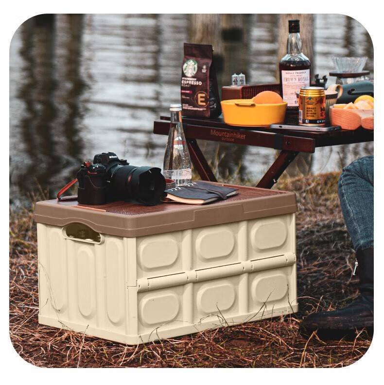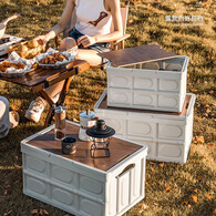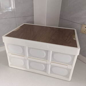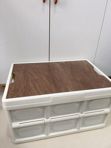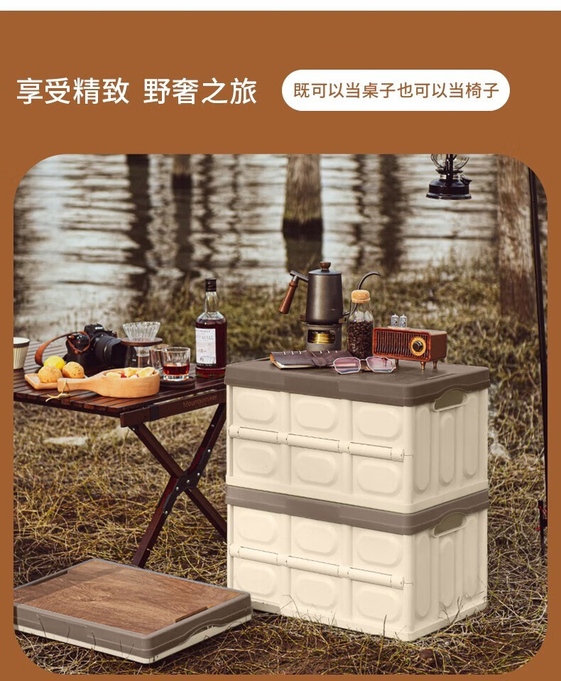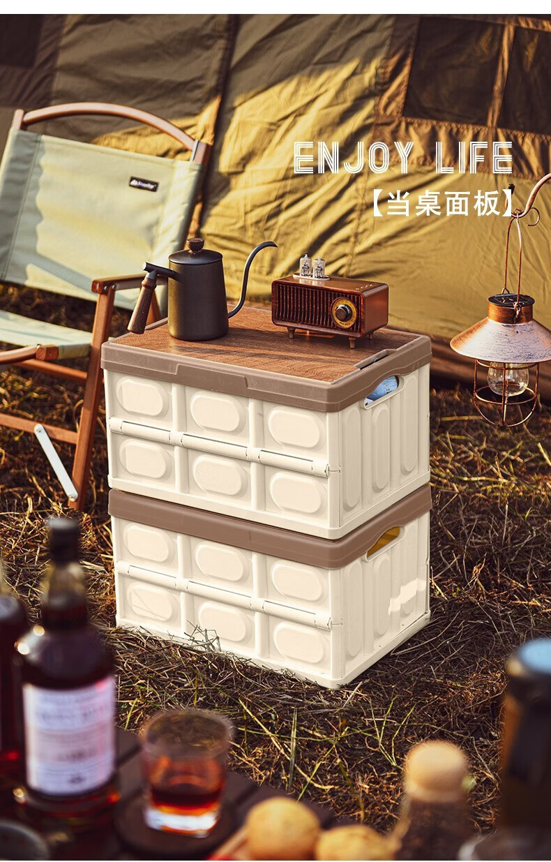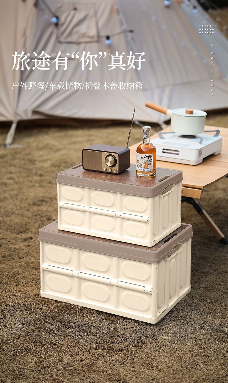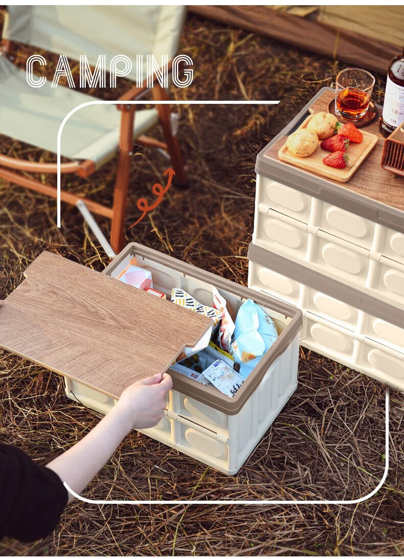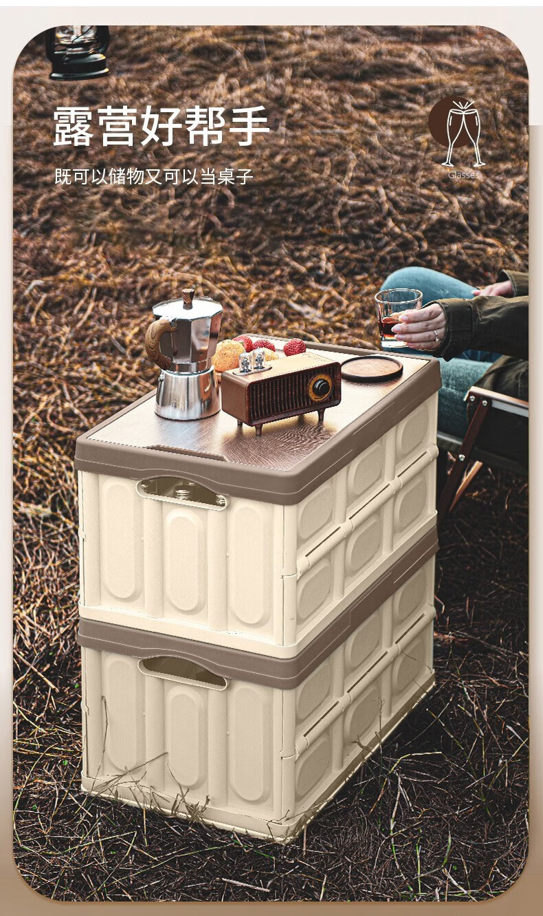 折叠箱设计非常合理,上面的木板简直绝了,颜值在线,还可以当小茶几,材质也很厚实,露营当收纳箱或者放后备箱收纳杂物都很合适。