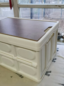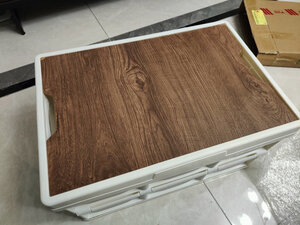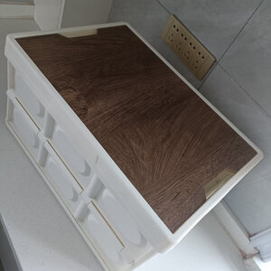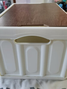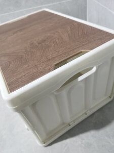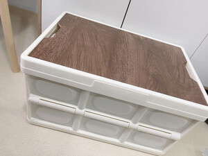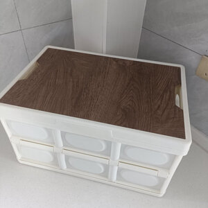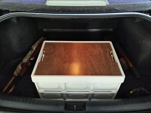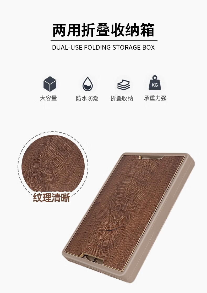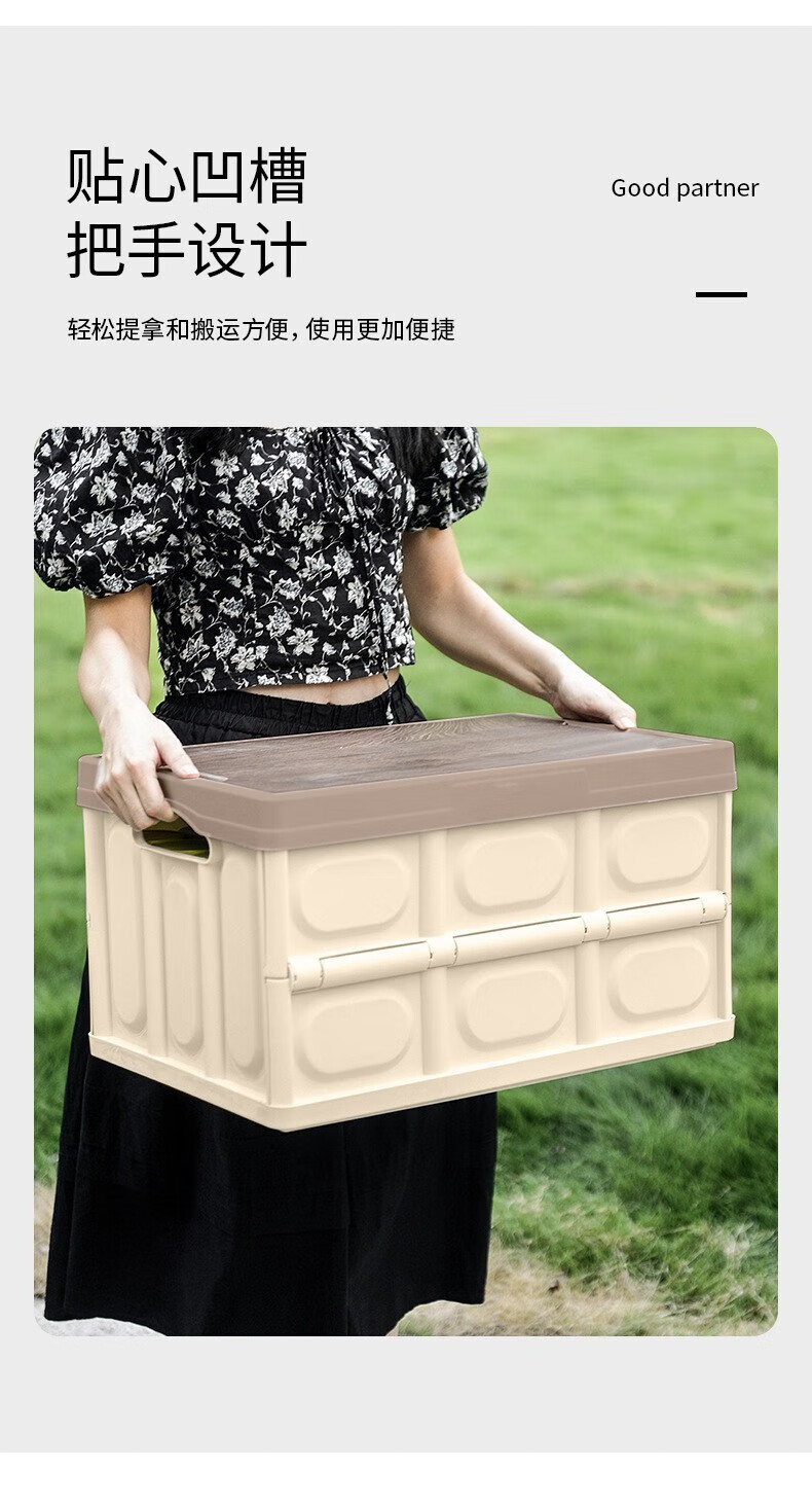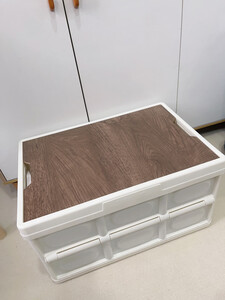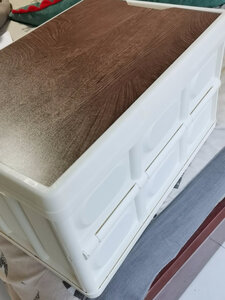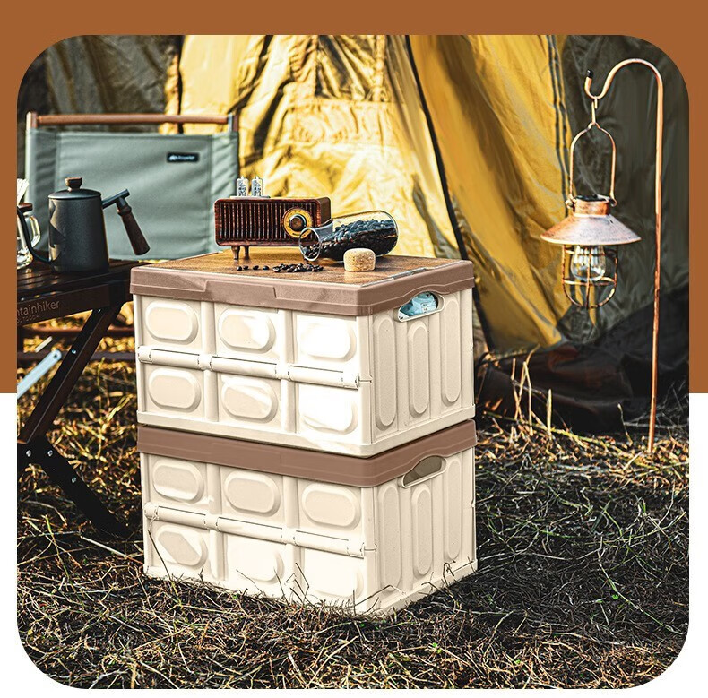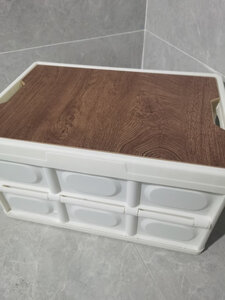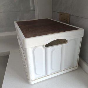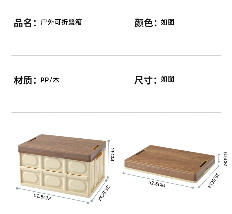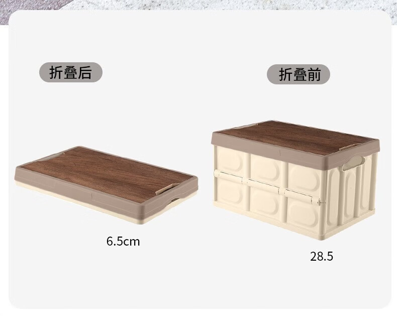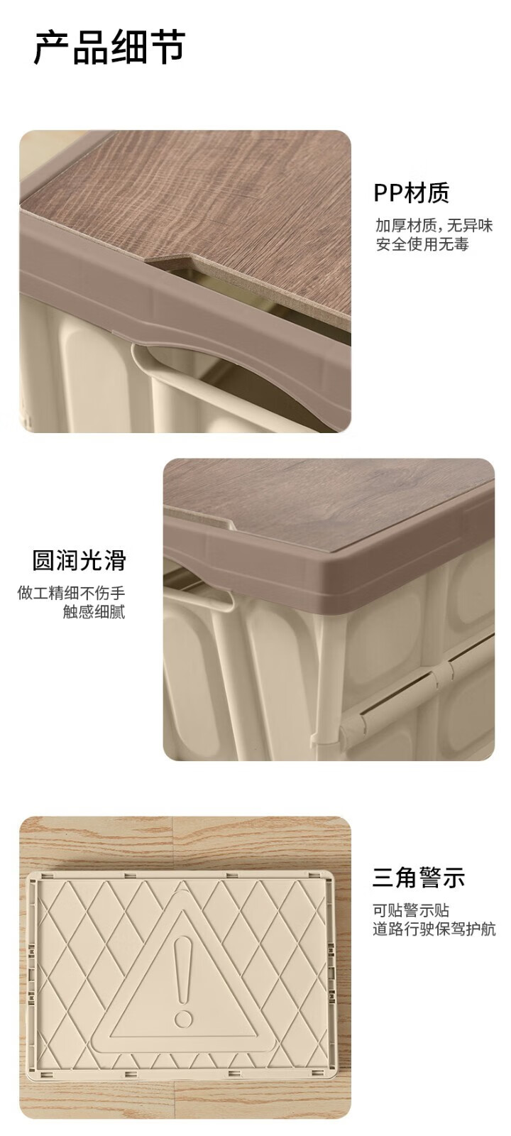折叠箱设计非常合理,上面的木板简直绝了,颜值在线,还可以当小茶几,材质也很厚实,露营当收纳箱或者放后备箱收纳杂物都很合适。