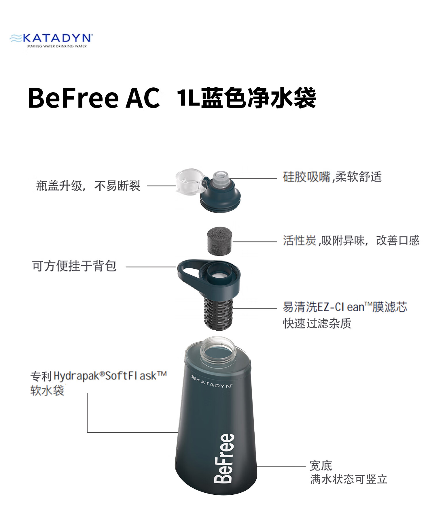 其次,BeFree AC 1L蓝色净水袋的容量为1升,正好满足您日常饮用的需求。其轻便易携的设计,使得您在户外活动中能够轻松携带,不受负担。此外,该产品的耐用性也相当出色,即使在恶劣的环境下也能保持稳定的性能。
